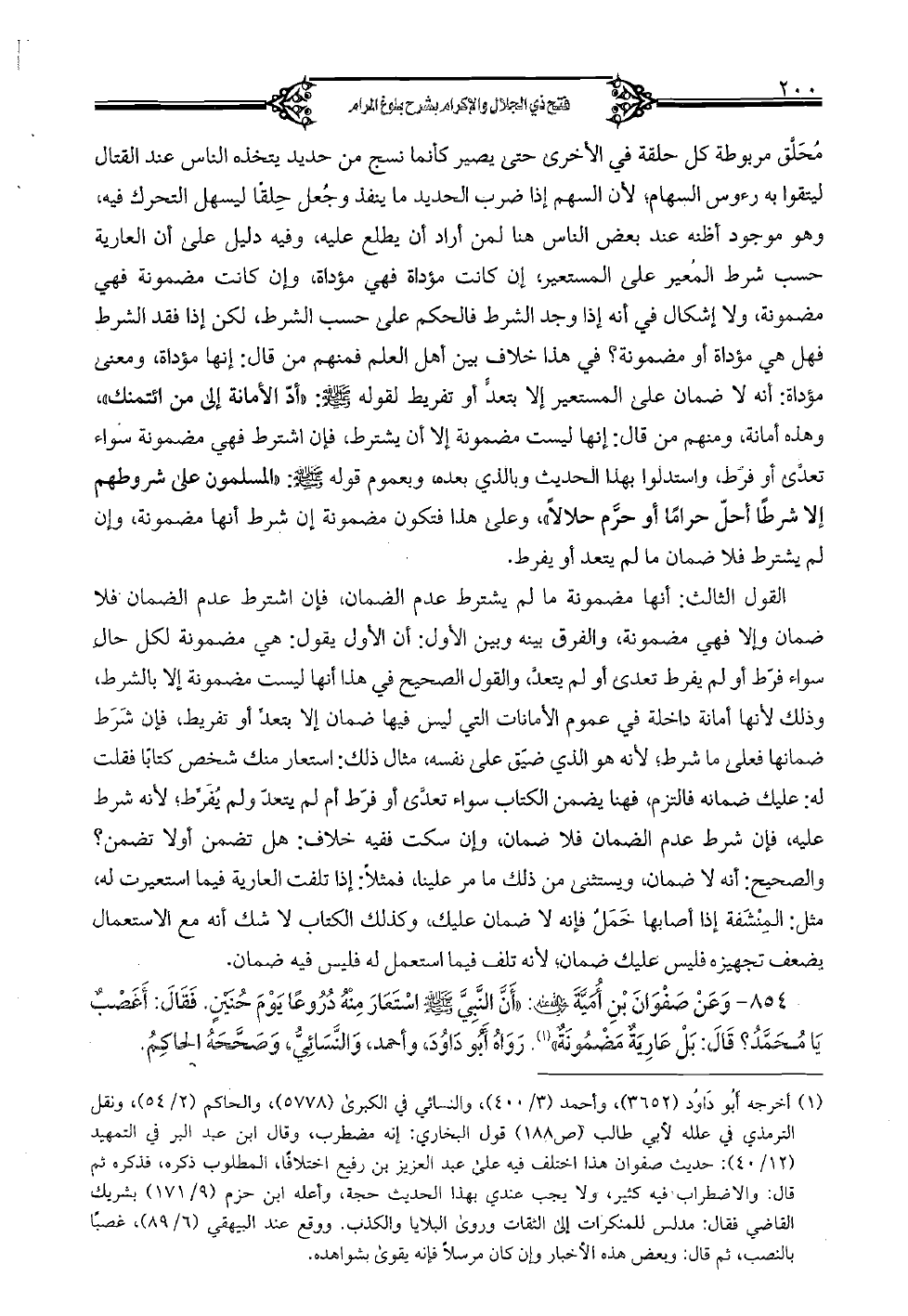 854 - وعن صفوان بن أمية رضي الله عنه: «أن النبي صلى الله عليه وسلم استعار منه دروعًا يوم حنين. فقال: أغصب يا محمد؟ قال: بل عارية مضمونة». رواه أبو داوود، وأحمد، والنسائي، وصححه الحاكم.