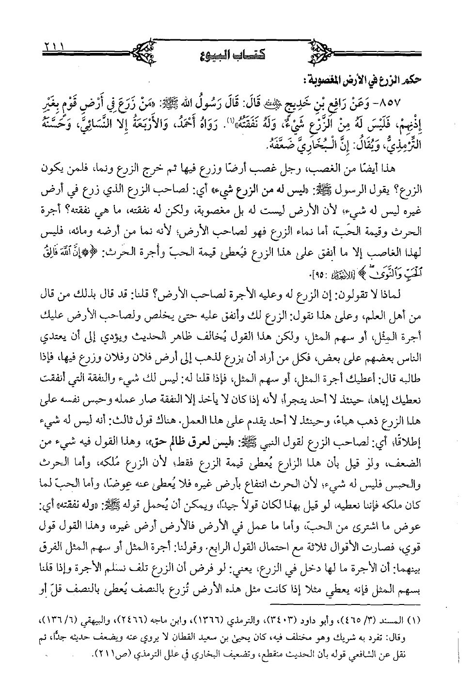 857 - وعن رافع بن خديج رضي الله عنه قال: قال رسول الله صلى الله عليه وسلم: «من زرع في أرض قوم بغير إذنهم، فليس له من الزرع شيء، وله نفقته». رواه أحمد، والأربعة إلا النسائي، وحسنه الترمذي، ويقال: إن البخاري ضعفه.