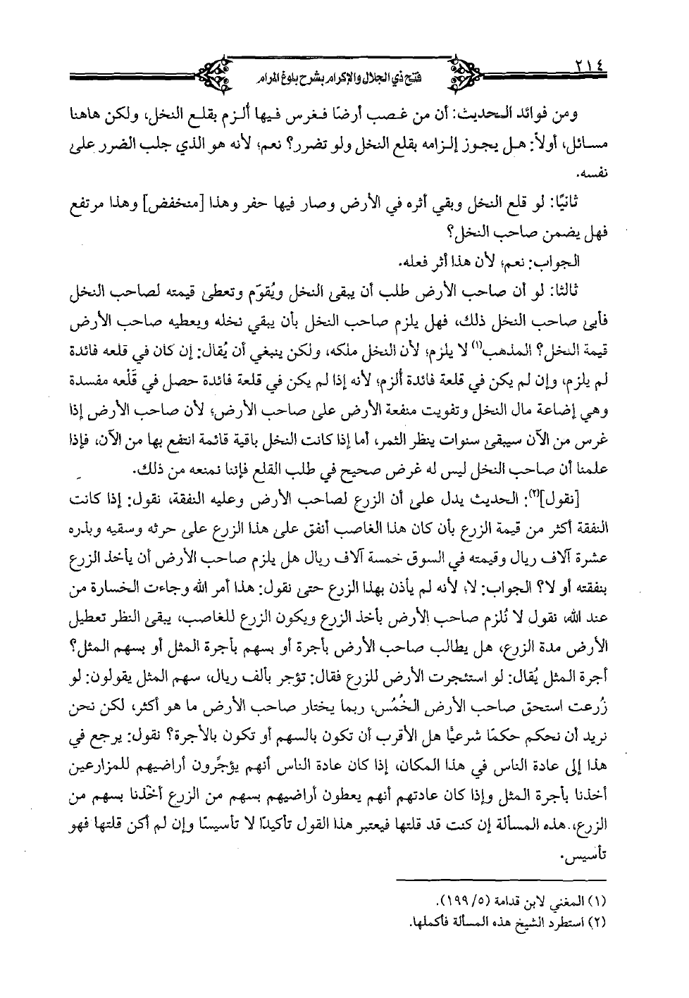 [نقول]: الحديث يدل على أن الزرع لصاحب الأرض وعليه النفقة، نقول: إذا كانت النفقة أكثر من قيمة الزرع بأن كان هذا الغاصب أنفق على هذا الزرع على حرثه وسقيه وبذره عشرة آلاف ريال وقيمته في السوق خمسة آلاف ريال هل يلزم صاحب الأرض أن يأخذ الزرع بنفقته أولا؟ الجواب: لا؛ لأنه لم يأذن بهذا الزرع حتى نقول: هذا أمر الله وجاءت الخسارة من عند الله، نقول لا نلزم صاحب الأرض بأخذ الزرع ويكون الزرع للغاصب، يبقى النظر تعطيل الأرض مدة الزرع، هل يطالب صاحب الأرض بأجرة أو بسهم بأجرة المثل أو بسهم المثل؟ أجرة المثل يقال: لو استأجرت الأرض للزرع فقال: تؤجر بألف ريال، سهم المثل يقولون: لو زرعت استحق صاحب الأرض الخمس، ربما يختار صاحب الأرض ما هو أكثر، لكن نحن نريد أن نحكم حكمًا شرعيًا هل الأرق أن تكون بالسهم أو تكون بالأجرة؟ نقول: يرجع في هذا إلى عادة الناس في هذا المكان، إذا كان عادة الناس أنهم يؤجرون أراضيهم للمزارعين أخذنا بأجرة المثل وإذا كان عادتهم أنهم يعطون أراضيهم بسهم من الزرع أخذنا بسهم من الزرع، هذه المسألة إن كنت قد قلتها فيعتبر هذا القول تأكيدًا لا تأسيسًا وإن لم أكن قلتها فهو تأسيس.