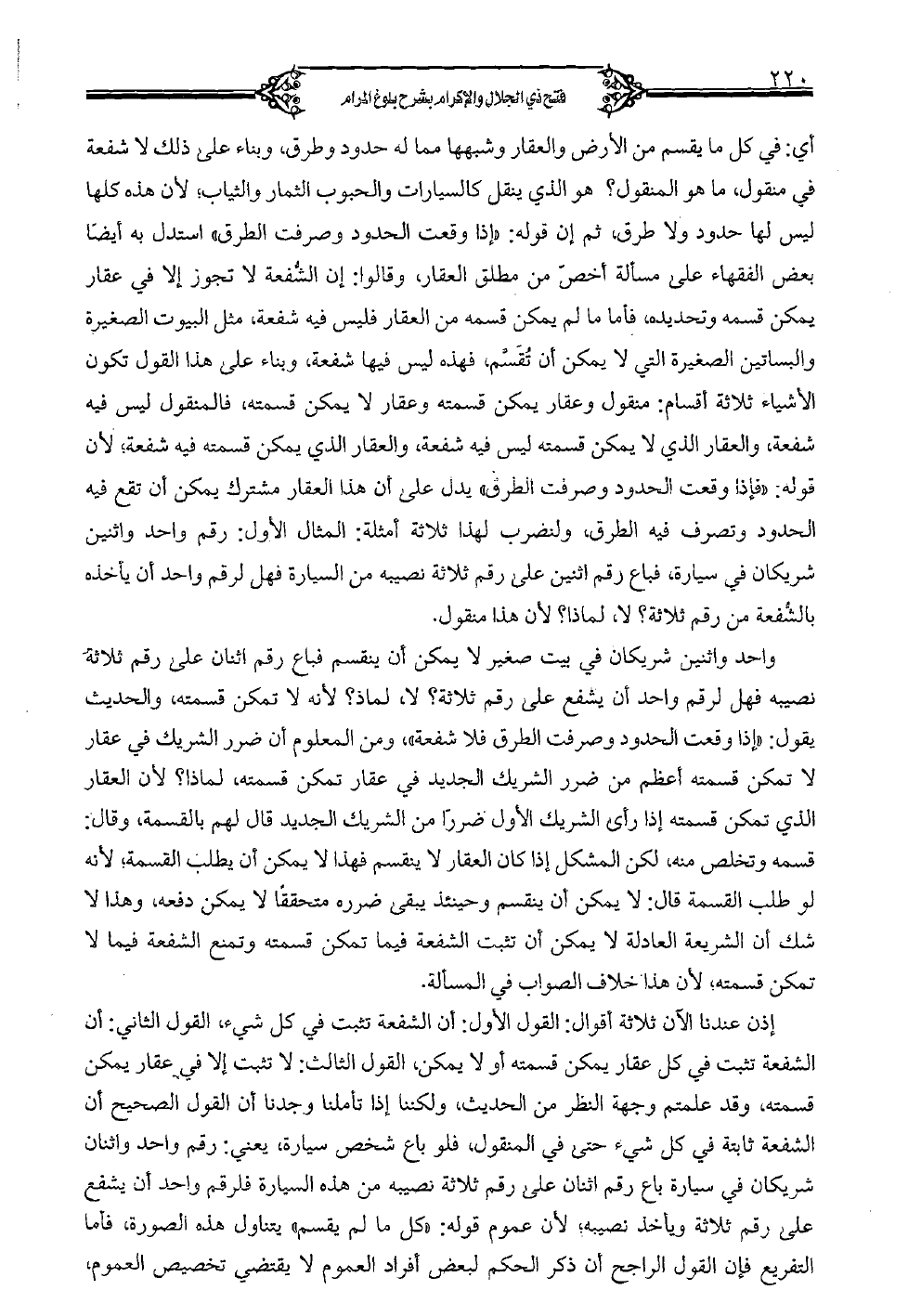 إذن عندنا الآن ثلاثة أقوال: القول الأول: أن الشفعة تثبت في كل شيء، القول الثاني: أن الشفعة تثبت في كل عقار يمكن قسمته أو لا يمكن، القول الثالث: لا تثبت إلا في عقار يمكن قسمته، وقد علمتم وجهة النظر من الحديث، ولكننا إذا تأملنا وجدنا أن القول الصحيح أن الشفعة ثابتة في كل شيء حتى في المنقول، فلو باع شخص سيارة، يعني: رقم واحد واثنان شريكان في سيارة باع رقم اثنان على رقم ثلاثة نصيبه من هذه السيارة فلرقم واحد أن يشفع على رقم ثلاثة ويأخذ نصيبه؛ لأن عموم قوله: "كل ما لم يقسم" يتناول هذه الصورة، فأما التفريع فإن القول الراجح أن ذكر الحكم لبعض أفراد العموم لا يقتضي تخصيص العموم،