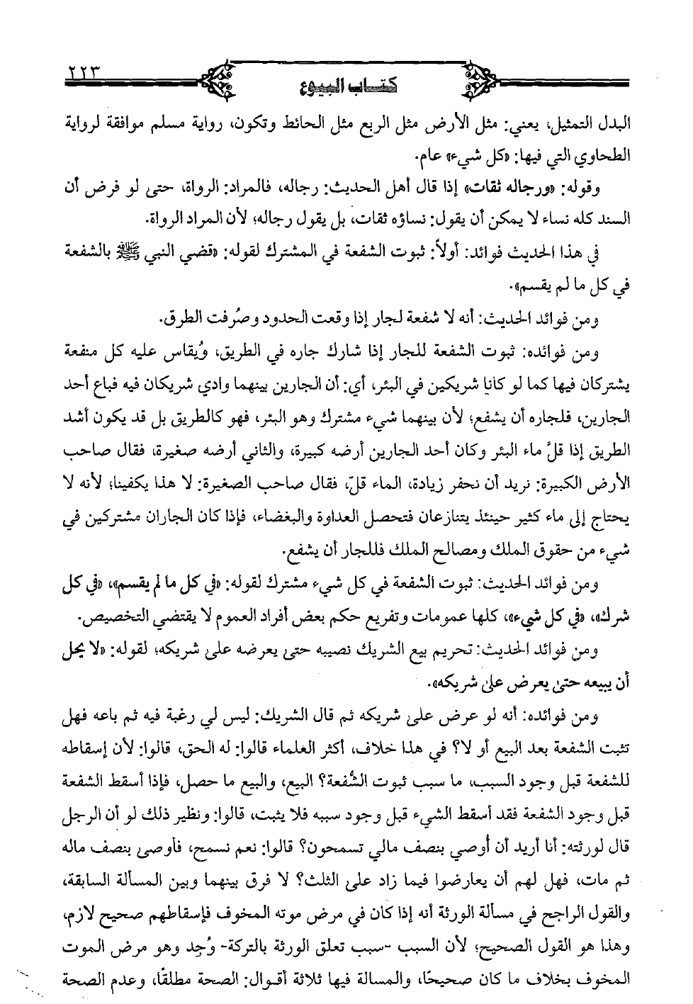 ومن فوائده: أنه لو عرض على شريكه ثم قال الشريك: ليس لي رغبة فيه ثم باعه فهل تثبت الشفعة بعد البيع أو لا؟ في هذا خلاف، أكثر العلماء قالوا: له الحق، قالوا: لأن إسقاطه للشفعة قبل وجود السبب، ما سبب ثبوت الشفعة؟ البيع، والبيع ما حصل، فإذا أسقط الشفعة قبل وجود الشفعة فقد أسقط الشيء قبل وجود سببه فلا يثبت، قالوا: ونظير ذلك لو أن الرجل قال لورثته: أنا أريد أن أوصي بنصف مالي تسمحون؟ قالوا: نعم نسمح، فأوصى بنصف ماله ثم مات، فهل لهم أن يعارضوا فيما زاد على الثلث؟ لا فرق بينهما وبين المسألة السابقة، والقول الراجح في مسألة الورثة أنه إذا كان في مرض موته المخوف فإسقاطهم صحيح لازم، وهذا هو القول الصحيح؛ لأن السبب - سبب تعلق الورثة بالتركة - وجد وهو مرض الموت المخوف بخلاف ما كان صحيحًا، والمسألة فيها ثلاثة أقوال: الصحة مطلقًا، وعدم الصحة