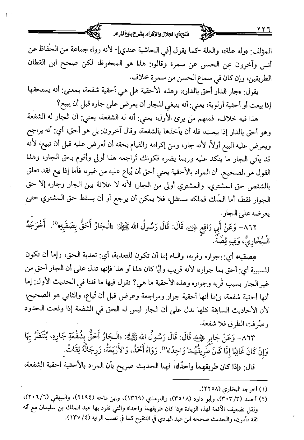 863 - وعن جابر رضي الله عنه قال: قال رسول الله صلى الله عليه وسلم: «الجار أحق بشفعة جاره، ينتظر بها وإن كان غائبًا إذا كان طريقهما واحدًا». رواه أحمد، والأربعة، ورجاله ثقات.