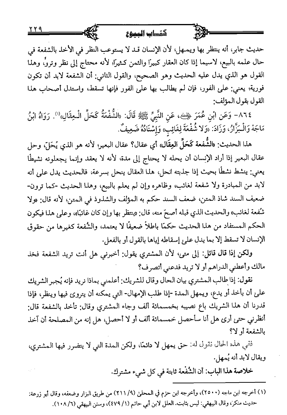 هذا الحديث: «الشفعة كحل العقال» أي عقال؟ عقال البعير؛ لأنه هو الذي يحل، وحل عقال البعير إذا أراد الإنسان أن يحله لا يحتاج إلى مدة؛ لأنه لا يعقد وإنما يجعلونه نشيطًا يعني: ينشط نشطًا بحيث إذا جذبته انحل، هذا العقال ينحل بسرعة، فالحديث يدل على أنه لابد من المبادرة ولا شفعة لغائب، وظاهره وإن لم يعلم بالبيع، وهذا الحديث - كما ترون - ضعيف السند شاذ المتن، ضعف السند حكم به المؤلف والشذوذ في المتن؛ لأنه قال: «ولا شفعة لغائب» والحديث الذي قبله أصح منه، قال: «ينتظر بها وإن كان غائبًا»، وعلى هذا فيكون الحكم المستفاد من هذا الحديث حكمًا باطلاً ضعيفًا لا يعتمد، والشفعة كغيرها من حقوق الإنسان لا تسقط إلا بما يدل على إسقاطه إياها بالقول أو بالفعل.
