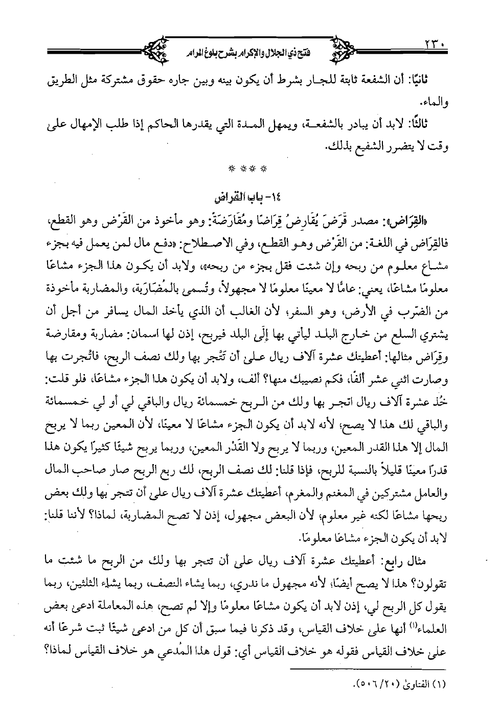 "القراض": مصدر قرض يقارض قراضًا ومقارضة: وهو مأخوذ من القرض وهو القطع، فالقراض في اللغة: من القرض وهو القطع، وفي الاصطلاح: "دفع مال لمن يعمل فيه بجزء مشاع معلوم من ربحه وإن شئت فقل بجزء من ربحه"، ولابد أن يكون هذا الجزء مشاعًا معلومًا مشاعًا، يعني: عامًا لا معينًا معلومًا لا مجهولاً، وتسمى بالمضاربة، والمضاربة مأخوذة من الضرب في الأرض، وهو السفر؛ لأن الغالب أن الذي يأخذ المال يسافر من أجل أن يشتري السلع من خارج البلد ليأتي بها إلى البلد فيربح، إذن لها اسمان: مضاربة ومقارضة وقراض مثالها: أعطيتك عشرة آلاف ريال على أن تتجر بها ولك نصف الربح، فاتجرت بها وصارت اثني عشر ألفًا، فكم نصيبك منها؟ ألف، ولابد أن يكون هذا الجزء مشاعًا، فلو قلت: خذ عشرة آلاف ريال اتجر بها ولك من الربح خمسمائة ريال والباقي لي أو لي خمسمائة والباقي لك هذا لا يصح؛ لأنه لابد أن يكون الجزء مشاعًا لا معينًا، لأن المعين ربما لا يربح المال إلا هذا القدر المعين، وربما لا يربح ولا القدر المعين، وربما يربح شيئًا كثيرًا يكون هذا قدرًا معينًا قليلاً بالنسبة للربح، فإذا قلنا: لك نصف الربح، لك ربع الربح صار صاحب المال والعامل مشتركين في المغنم والمغرم، أعطيتك عشرة آلاف ريال على أن تتجر بها ولك بعض ربحها مشاعًا لكنه غير معلوم؛ لأن البعض مجهول، إذن لا تصح المضاربة، لماذا؟ لأننا قلنا: لابد أن يكون الجزء مشاعًا معلومًا.