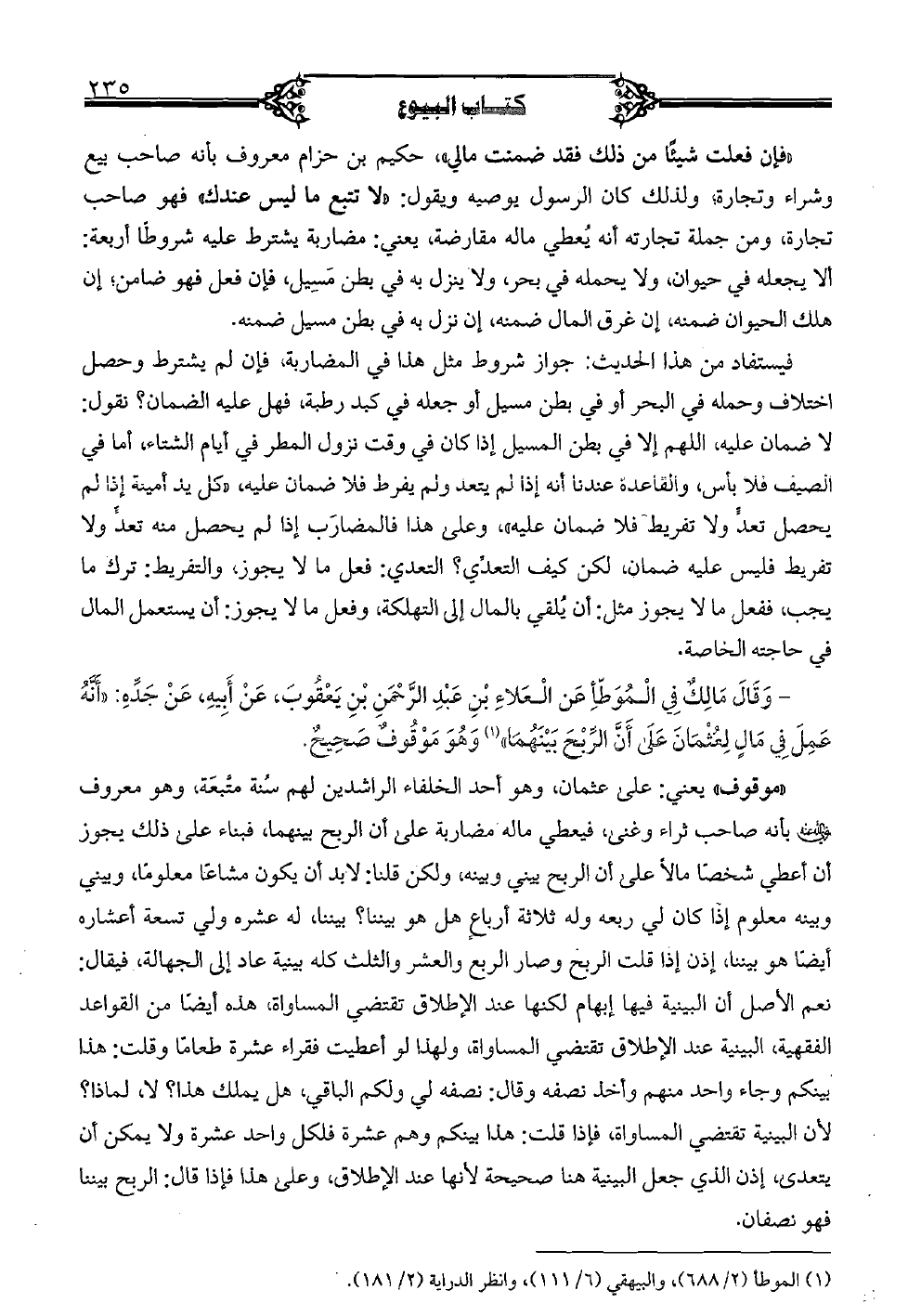 "موقوف" يعني: على عثمان، وهو أحد الخلفاء الراشدين لهم سنة متبعة، وهو معروف رضي الله عنه بأنه صاحب ثراء وغنى، فيعطي ماله مضاربة على أن الربح بينهما، فبناء على ذلك يجوز أن أعطي شخصًا مالاً على أن الربح بيني وبينه، ولكن قلنا: لابد أن يكون مشاعًا معلومًا، وبيني وبينه معلوم إذا كان لي ربعه وله ثلاثة أرباعٍ هل هو بيننا؟ بيننا، له عشرة ولي تسعة أعشاره أيضًا هو بيننا، إذن إذا قلت الربح وصار الربع والعشر والثلث كله بينية عاد إلى الجهالة، فيقال: نعم الأصل أن البينية فيها إبهام لكنها عند الإطلاق تقتضي المساواة، هذه أيضًا من القواعد الفقهية، البينية عند الإطلاق تقضي المساواة، ولهذا لو أعطيت فقراء عشرة طعامًا وقلت: هذا بينكم وجاء واحد منهم وأخذ نصفه وقال: نصفه لي ولكم الباقي، هل يملك هذا؟ لا، لماذا؟ لأن البينية تقتضي المساواة، فإذا قلت: هذا بينكم وهم عشرة فلكل واحد عشرة ولا يمكن أن يتعدى، إذن الذي جعل البينية هنا صحيحة لأنها عند الإطلاق، وعلى هذا فإذا قال: الربح بيننا فهو نصفان.