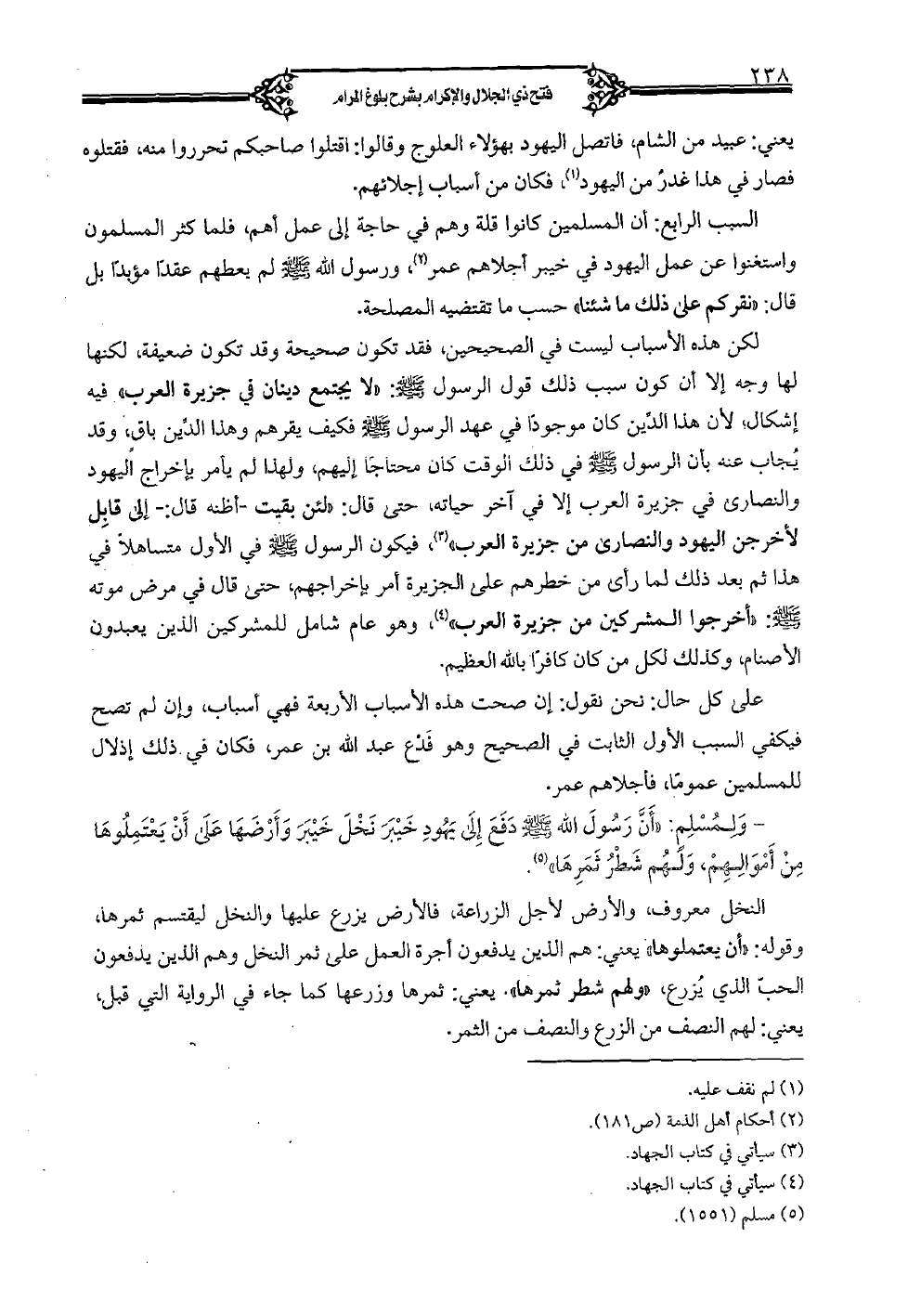 لكن هذه الأسباب ليست في الصحيحين، فقد تكون صحيحة وقد تكون ضعيفة، لكنها لها وجه إلا أن كون سبب ذلك قول الرسول صلى الله عليه وسلم: «لا يجتمع دينان في جزيرة العرب» فيه إشكال؛ لأن هذا الدين كان موجودًا في عهد الرسول صلى الله عليه وسلم فكيف يقرهم وهذا الدين باقٍ، وقد يجاب عنه بأن الرسول صلى الله عليه وسلم في ذلك الوقت كان محتاجًا إليهم، ولهذا لم يأمر بإخراج اليهود والنصارى في جزيرة العرب إلا في آخر حياته، حتى قال: «لئن بقيت - أظنه قال: - إلى قابل لأخرجن اليهود والنصارى من جزيرة العرب»، فيكون الرسول صلى الله عليه وسلم في الأول متساهلاً في هذا ثم بعد ذلك لما رأى من خطرهم على الجزيرة أمر بإخراجهم، حتى قال في مرض موته صلى الله عليه وسلم: «أخرجوا المشركين من جزيرة العرب»، وهو عام شامل للمشركين الذين يعبدون الأصنام، وكذلك لكل من كان كافرًا بالله العظيم.