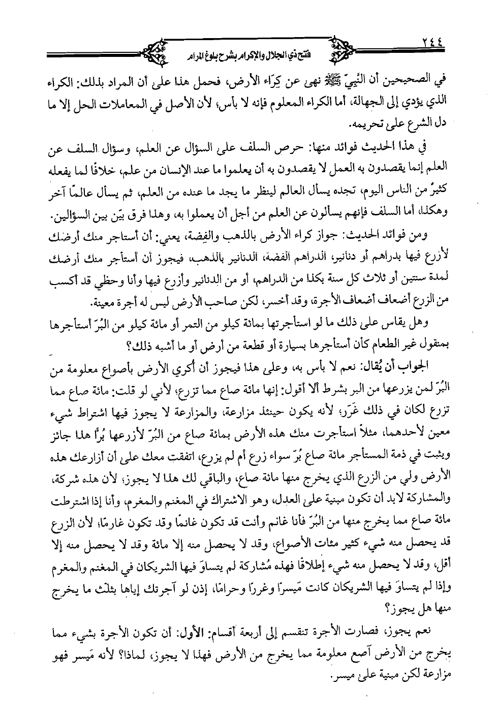 الجواب أن يقال: نعم لا بأس به، وعلى هذا فيجوز أن أكري الأرض بأصواع معلومة من البر لمن يزرعها من البرد بشرط ألا أقول: إنها مائة صاع مما تزرع؛ لأني لو قلت: مائة ضاع مما تزرع لكان في ذلك غرر؛ لأنه يكون حينئذ مزارعة، والمزارعة لا يجوز فيها اشتراط شيء معين لأحدهما، مثلاً استأجرت منك هذه الأرض بمائة صاع من البر لأزرعها برًا هذا جائز ويثبت في ذمة المستأجر مائة صاع بر سواء زرع أم لم يزرع، اتفقت معك على أن أزارعك هذه الأرض ولي من الزرع الذي يخرج مها مائة صاع، والباقي لك هذا لا يجوز؛ لأن هذه شركة والمشاركة لابد أن تكون مبنية على العدل، وهو الاشتراك في المغنم والمغرم، وأنا إذا اشترطت مائة صاع مما يخرج منها من البر فأنا غانم وأنت قد تكون غانمًا وقد تكون غارمًا؛ لأن الزرع قد يحصل منه شيء كثير مئات الأصواع، وقد لا يحصل منه إلا مائة وقد لا يحصل منه إلا أقل، وقد لا يحصل منه شيء إطلاقًا فهذه المشاركة لم يتساو فيها الشريكان في المغنم والمغرم وإذا لم يتساو فيها الشريكان كانت ميسرًا وغررًا وحرامًا، إذن لو آجرتك إياها بثلث ما يخرج منها هل يجوز؟