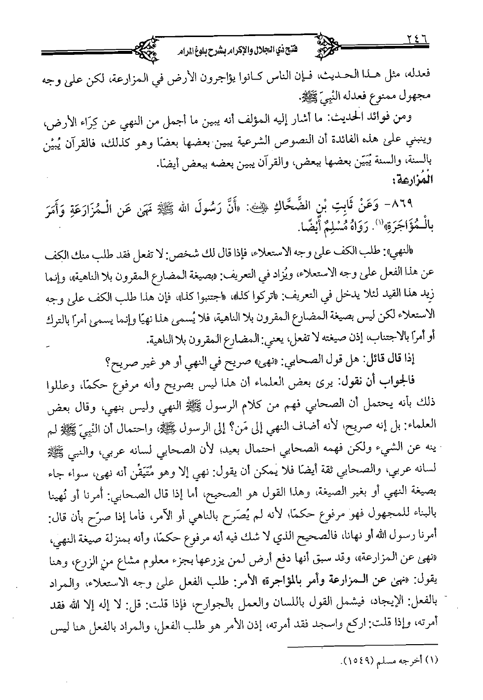 فالجواب أن نقول: يرى بعض العلماء أن هذا ليس بصريح وأنه مرفوع حكمًا، وعللوا ذلك بأنه يحتمل أن الصحابي فهم من كلام الرسول صلى الله عليه وسلم النهي وليس بنهي، وقال بعض العلماء: بل إنه صريح؛ لأنه أضاف النهي إلى من؟ إلى الرسول صلى الله عليه وسلم، واحتمال أن النبي صلى الله عليه وسلم لم ينه عن الشيء ولكن فهمه الصحابي احتمال بعيد؛ لأن الصحابي لسانه عربي، والنبي صلى الله عليه وسلم لسانه عربي، والصحابي ثقة أيضًا فلا يمكن أن يقول: نهي إلا وهو متيقن أنه نهى، سواء جاء بصيغة النهي أو بغير الصيغة وهذا القول هو الصحيح، أما إذا قال الصحابي: أمرنا أو نهينا بالبناء للمجهول فهو مرفوع حكمًا؛ لأنه لم يصرح بالناهي أو الآمر، فأما إذا صرح بأن قال: أمرنا رسول الله أو نهانا، فالصحيح الذي لا شك فيه أنه مرفوع حكمًا، وأنه منزلة صيغة النهي، "نهى عن المزارعة"، وقد سبق أنها دفع أرض لمن يزرعها بجز معلوم مشاع من الزرع، وهنا يقول: "نهى عن المزارعة وأمر بالمؤاجرة" الأمر: طلب الفعل على وجه الاستعلاء، والمراد بالفعل: الإيجاد، فيشمل القول باللسان والعمل بالجوارح، فإذا قلت: قل: لا إله إلا الله فقد أمرته، وإذا قلت: ارجع واسجد فقد أمرته، إذن الأمر هو طلب الفعل، والمراد بالفعل هنا ليس