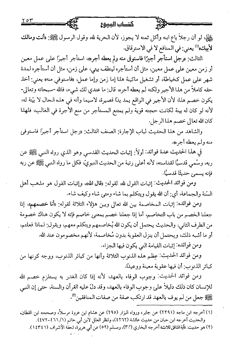 ومن فوائده: إثبات المخاصمة بين الله تعالى وبين هؤلاء الثلاثة لقوله: "أنا خصمهم" إذا جعلنا الخصم من باب التخاصم، أما إذا جعلنا خصم بمعنى خاصم فإنه لا يكون هناك خصومة من الطرف الثاني، والحديث يحتمل أن يكون الله يخاصمهم ويتكلم معهم، ويقول: لماذا فعلتم، أو ما أشبه ذلك، ويحتمل ان ينزل العقوبة بدون مخاصمة؛ لأنهم مخصومون عند الله.