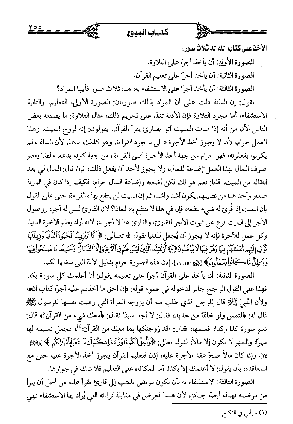 نقول: إن السنة دلت على أن المراد بذلك صورتان: الصورة الأولى، التعليم، والثانية الاستشفاء، أما مجرد التلاوة فإن الأدلة تدل على تحريم ذلك، مثال التلاوة: ما يصنعه بعض الناس الآن من أنه إذا مات الميت أتوا بقارئ يقرأ القرآن، يقولون: إنه لروح الميت، وهذا العمل حرام؛ لأنه لا يجوز أخذ الأجرة على مجرد القراءة، وهو كذلك بدعة؛ لأن السلف لم يكونوا يفعلونه، فهو حرام من جهة أخذ الأجرة على القراءة ومن جهة كونه يدعه، ولهذا يعتبر صرف المال لهذا العلم إضاعة للمال، ولا يجوز لأحد أن يفعل ذلك، فإن قال: المال لي بعد انتقاله من الميت، قلنا: نعم هو لك لكن أضعته وإضاعة المال حرام، فكيف إذا كان في الورثة صغار وأخذ هذا من نصيبهم يكون أشد وأشد، ثم إن الميت لن ينتفع بهذه القراءة، حتى على القول بأن الميت إذا قرئ له شيء ينفعه، فإن في هذا لا ينتفع به، لماذا؟ القارئ ليس له أجر، ووصول الأجر إلى الميت فرع عن ثبوت الأجر للقارئ، والقارئ هنا لا أجر له؛ لأنه أراد بعلم الآخرة الدنيا، وكل عمل للآخرة فإنه لا يجوز أن يجعل للدنيا لقول الله تعالى: {كان يريد الحيوة الدنيا وزينتها نوف إليهم أعمالهم فيها وهم فيها لا يبخسون أولئك الذين ليس لهم في الآخرة إلا النار وحبط ما صنعوا فيها وبطل ما كانوا يعملون} [هود: 15، 16]. إذن هذه الصورة حرام بدليل الآية التي سقتها لكم.