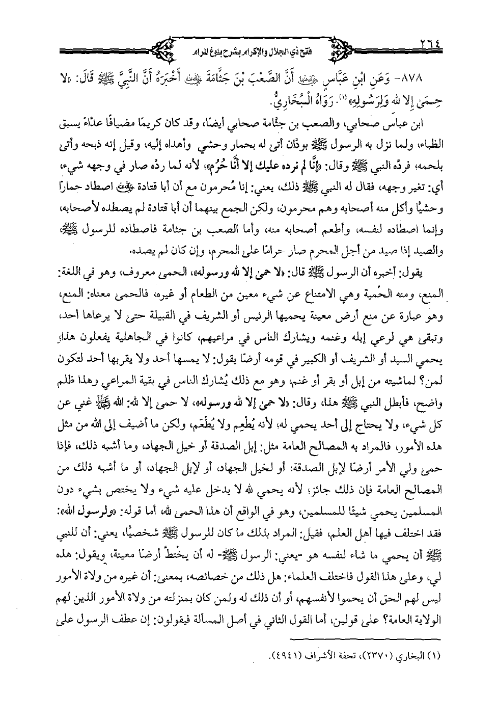 878 - وعن ابن عباس رضي الله عنه أن الصعب بن جثامة رضي الله عنه أخبره أن النبي صلى الله عليه وسلم قال: «لا حمى إلا لله ولرسوله». رواه البخاري.