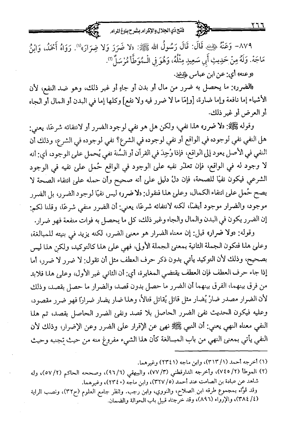 879 - وعنه رضي الله عنه قال: قال رسول الله صلى الله عليه وسلم: «لا ضرر ولا ضرار». رواه أحمد، وابن ماجه. وله من حديث أبي سعيد مثله، وهو في الموطأ مرسل.
