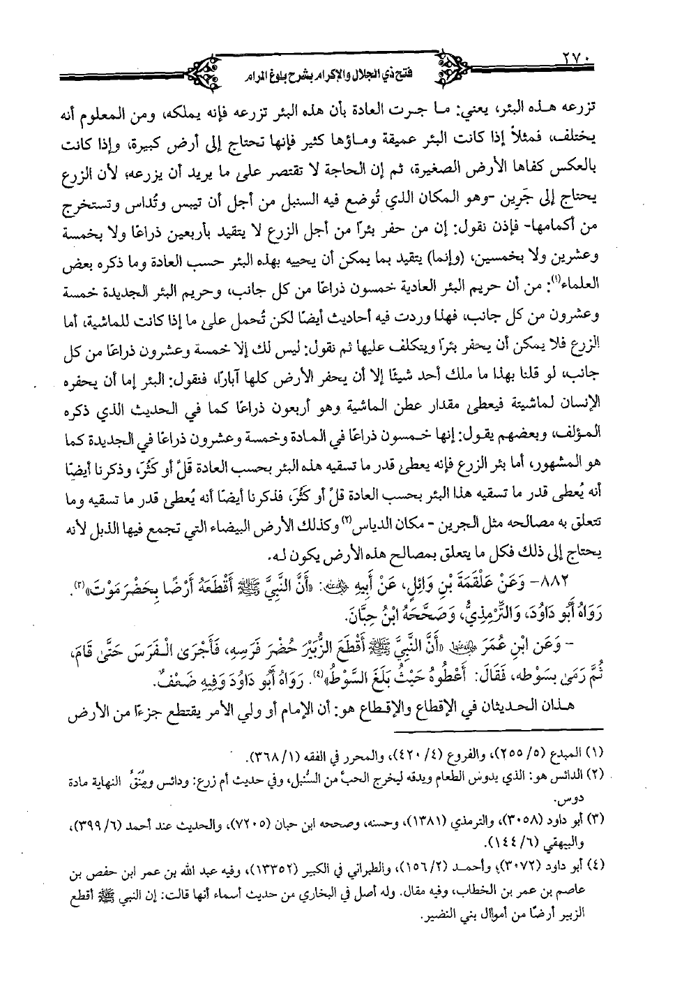 - وعن ابن عمر رضي الله عنه «أن النبي صلى الله عليه وسلم أقطع الزبير حضر فرسه، فأجرى الفرس حتى قام ثم رمى بسوطه، فقال: أعطوه حيث بلغ السوط». رواه أبو داود وفيه ضعف.