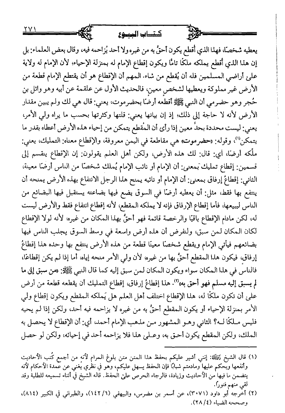 يعطيه شخصًا، فهذا الذي أقطع يكون أحق به من غيره ولا أحد يزاحمه فيه، وقال بعض العلماء: بل إن هذا الذي أقطع يملكه ملكًا تامًا ويكون إقطاع الإمام له بمنزلة الإحياء؛ لأن الإمام له ولاية على أراضي المسلمين فله أن يقطع من شاء. المهم أن الإقطاع هو أن يقتطع الإمام قطعة من الأرض غير مملوكة ويعطيها لشخصٍ معينٍ، فالحديث الأول عن علقمة عن أبيه وهو وائل بن حجر وهو حضرمي أن النبي صلى الله عليه وسلم أقطعه أرضًا بحضر موت، يعني: قال هي لك ولم يبين مقدار الأرض لأنه لا حاجة إلى ذلك؛ إذ إن بيانها يعين: قلتها وكثرتها بحسب ما يراه ولي الأمر، يعني: ليست محددة بحد معين إذا رأى أن المقطع يتمكن من إحياء هذه الأرض أعطاه بقدر ما يتمكن، وقوله: "حضر موت" هي مقاطعة في اليمن معروفة، والإقطاع معناه: التمليك، يعني: ملكه أرضًا، أي: قال: لك هذه الأرض، ولكن أهل العلم يقولون: إن الإقطاع ينقسم إلى قسمين: إقطاع تمليك بمعنى: أن الإمام أو نائب الإمام يملك شخصًا من الناس أرضًا معينة، الثاني: إقطاع إرفاق بمعنى: أن الإمام أو نائبه يمنح هذا الرجل الانتفاع بهذه الأرض يمنحه أن ينتفع بها فقط، مثل: أن يعطيه أرضًا في السوق يضع فيها بضاعته يستقل فيها البضائع من الناس ليبيعها، فأما إقطاع الإرفاق فإنه لا يملكه المقطع؛ لأنه إقطاع انتفاع فقط والأرض ليست له، لكن ما دام الإقطاع باقيًا والرخصة قائمة فهو أحق بهذا المكان من غيره؛ لأنه لولا الإقطاع لكان المكان لمن سبق، ولنفرض أن هذه أرض واسعة في وسط السوق يجلب الناس فيها بضائعهم فيأتي الإمام ويقطع شخصًا معينًا قطعة من هذه الأرض ينتفع بها وحده هذا إقطاع إرفاقٍ، فيكون هذا المقطع أحق بها من غيره؛ لأن ولي الأمر منحه إياه، أما إذا لم يكن إقطاعًا، فالناس في هذا المكان سواء ويكون المكان لمن سبق إليه كما قال النبي صلى الله عليه وسلم: «من سبق إلى ما لم يسبق إليه مسلم فهو أحق به». هذا إقطاع إرفاق، إقطاع التمليك أن يقطعه قطعة من أرض على أن تكون ملكًا له، هذا الإقطاع اختلف أهل العلم هل يملكه المقطع ويكون إقطاع ولي الأمر بمنزلة الإحياء أو يكون المقطع أحق به من غيره لا يزاحمه فيه أحد، ولكن إذا لم يحيه فليس ملكًا له؟ الثاني وهو المشهور من مذهب الإمام أحمد، أي: أن الإقطاع لا يحصل به الملك، ولكن المقطع يكون أحق به، وعلى هذا فلا يزاحمه أحد في إحيائه، ولكن لو حصل
