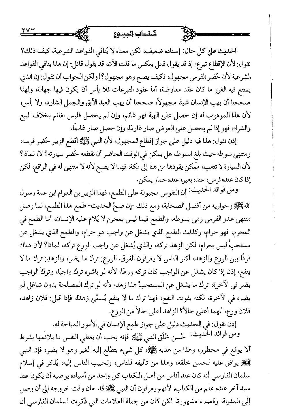 ومن فوائد الحديث: أن النفوس مجبولة على الطمع، فهذا الزبير بن العوام ابن عمة رسول الله صلى الله عليه وسلم وحواريه من أفضل الصحابة، ومع ذلك - إن صح الحديث - طمع هذا الطمع، لما وصل منتهى عدو الفرس رمى بسوطه، والطمع فيما ليس بمحرم لا يلام عليه الإنسان، أما الطمع في المحرم، فهو حرام، وكذلك الطمع الذي يشغل عن واجب هو حرام، والطمع الذي يشغل عن مستحب ليس بحرام، لكن الزهد تركه، والذي يشغل عن واجب الورع تركه، لماذا؟ لأن هناك فرقًا بين الورع والزهد، أكثر الناس لا يعرفون الفرق. الورع: ترك ما يضر، والزهد: ترك ما لا ينفع، إذن إذا كان يشغل عن الواجب كان تركه ورعًا؛ لأنه لو باشره ترك واجبًا، وترك الواجب يضر في الآخرة، ترك ما يشغل عن المستحب هذا زهد؛ لأنه لو ترك المصلحة بدون شاغل لم يضره في الآخرة، لكنه يفوت النفع، فهنا ترك ما لا ينفع يسمى زهدًا، فإذا قيل: فلان زاهد، فلان ورع، أيهما أعلى حالاً؟ الزاهد أعلى حالاً من الورع.