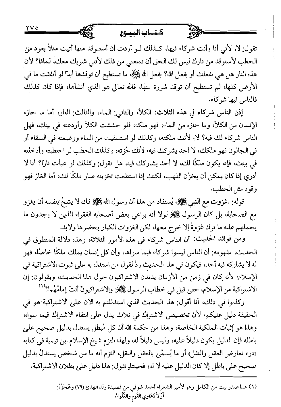 وكذبوا في ذلك، أنا أقول: هذا الحديث الذي استدللتم به الآن على الاشتراكية هو في الحقيقة دليل عليكم؛ لأن تخصيص الاشتراك في ثلاث يدل على انتفاء الاشتراك فيما وساه، وهذا هو إثبات الملكية الخاصة، وهذا من حكمة الله أن كل مبطل يستدل بدليل صحيح على باطله فإن الدليل يكون دليلًا عليه، وليس دليلاً له، ولهذا التزم شيخ الإسلام ابن تيمية في كتابه "درء تعارض العقل والنقل" أو ما يسمى بالعقل والنقل، التزم انه ما من شخص يستدل بدليل صحيح على باطل إلا كان الدليل عليه لا له؛ فحينئذٍ نقول: هذا دليل على بطلان الاشتراكية.