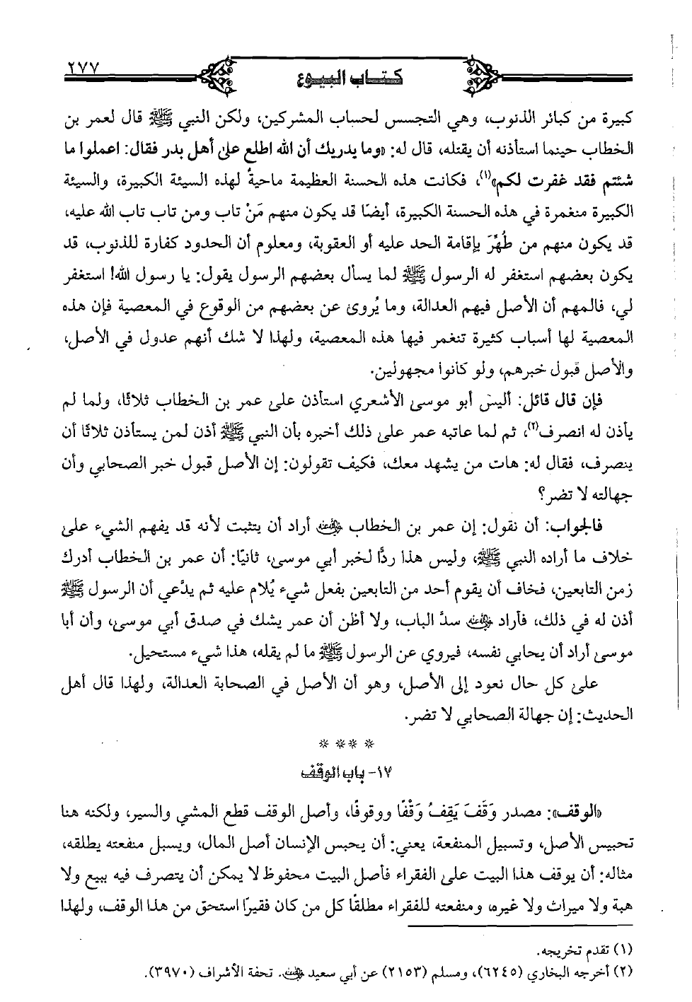 كبيرة من كبائر الذنوب، وهي التجسس لحساب المشركين، ولكن النبي صلى الله عليه وسلم قال لعمر بن الخطاب حينما استأذنه أن يقتله، قال له: «وما يدريك أن الله أطلع على أهل بدر فقال: اعملوا ما شئتم فقد غفرت لكم»، فكانت هذه الحسنة العظيمة ماحية لهذه السيئة الكبيرة، والسيئة الكبيرة منغمرة في هذه الحسنة الكبيرة، أيضًا قد يكون منهم من تاب ومن تاب تاب الله عليه، قد يكون منهم من طهر بإقامة الحد عليه أو العقوبة، ومعلوم أن الحدود كفارة للذنوب، قد يكون بعضهم استغفر له الرسول صلى الله عليه وسلم لما يسأل بعضهم الرسول يقول: يا رسول الله! استغفر لي، فالمهم أن الأصل فيهم العدالة، وما يروى عن بعضهم من الوقوع في المعصية فإن هذه المعصية لها أسباب كثيرة تنغمر فيها هذه المعصية، ولهذا لا شك أنهم عدول في الأصل، والأصل قبول خبرهم، ولو كانوا مجهولين.