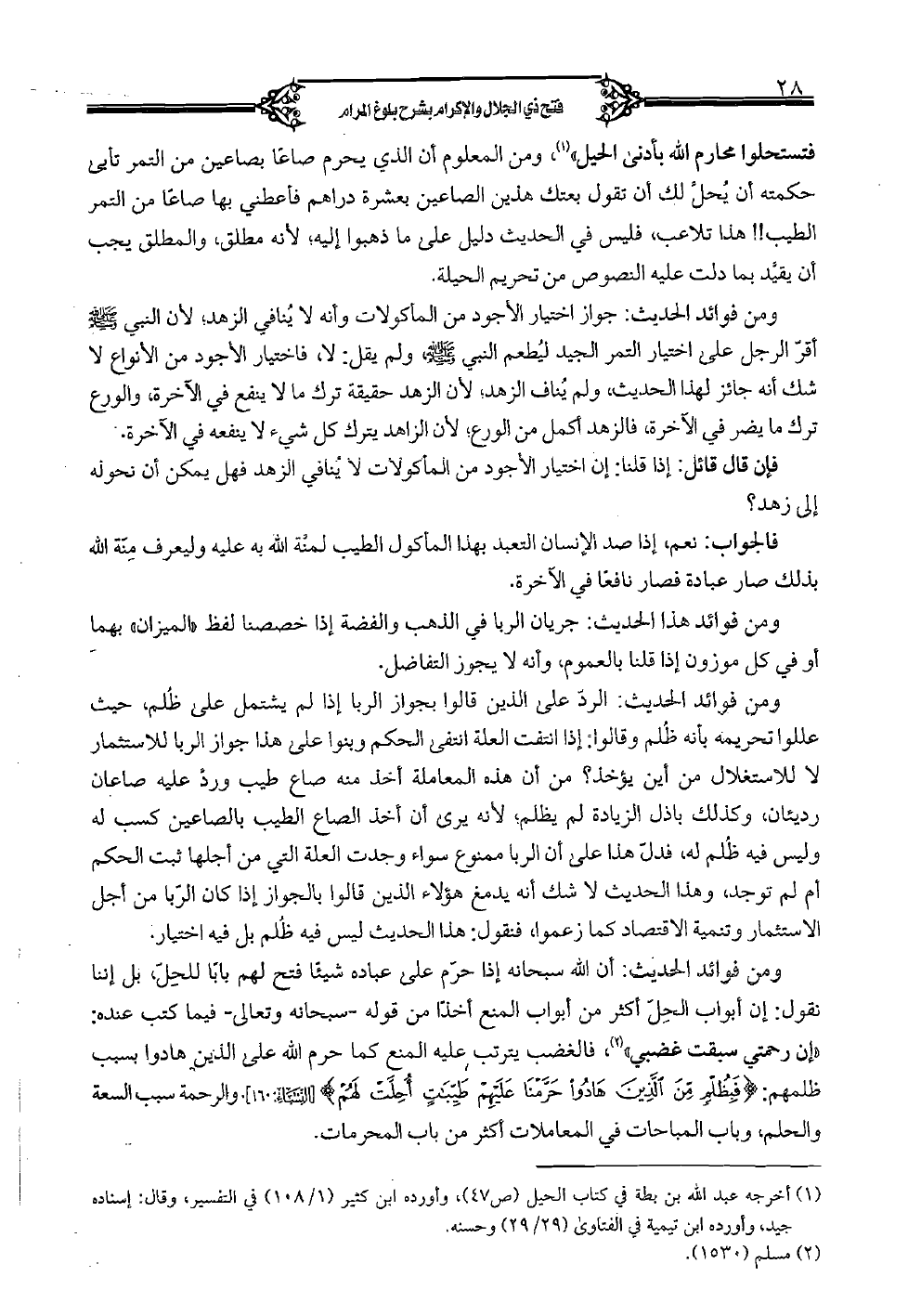 فتستحلوا محارم الله بأدنى الحيل»، ومن المعلوم أن الذي يحرم صاعا بصاعين من التمر تأبى حكمته أن يحل لك أن تقول بعتك هذين الصاعين بعشرة دراهم فأعطني بها صاعا من التمر الطيب! ! هذا تلاعب، فليس في الحديث دليل على ما ذهبوا إليه، لأنه مطلق، والمطلق يجب أن يقيد بما دلت عليه النصوص من تحريم الحيلة.
