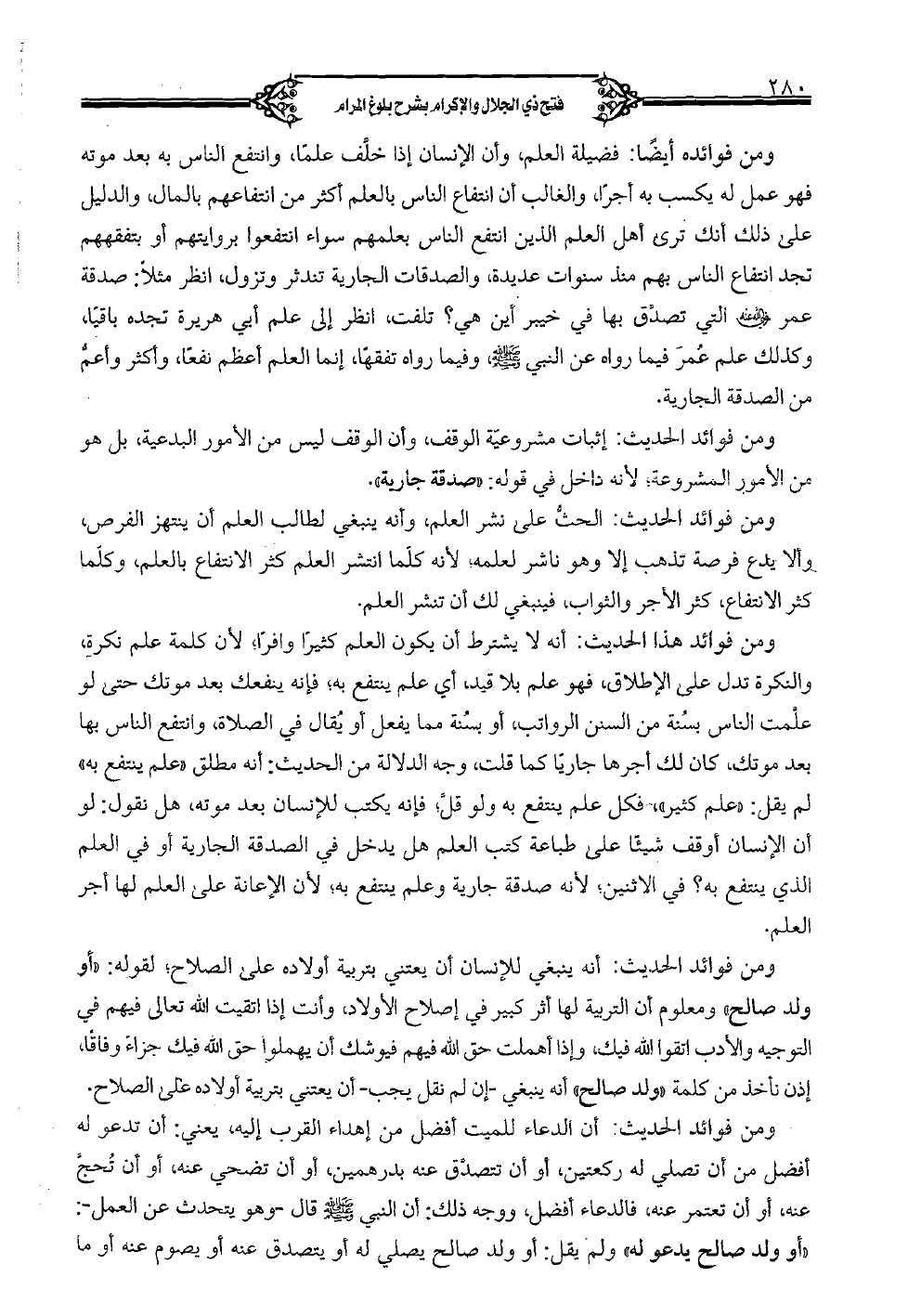 ومن فوائد هذا الحديث: أنه لا يشترط أن يكون العلم كثيرًا وافرًا؛ لأن كلمة علم نكرة، والنكرة تدل على الإطلاق، فهو علم بلا قيد، أي علم ينتفع به؛ فإنه ينفعك بعد موتك حتى لو علمت الناس بسنة من السنن الرواتب، أو بسنة مما يفعل أو يقال في الصلاة، وانتفع الناس بها بعد موتك، كان لك أجرها جاريًا كما قلت، وجه الدلالة من الحديث: أنه مطلق "علم ينتفع به" لم يقل: "علم كثير"، فكل علم ينتفع به ولو قل؛ فإنه يكتب للإنسان بعد موته، هل نقول: لو أن الإنسان أوقف شيئًا على طباعة كتب العلم هل يدخل في الصدقة الجارية أو في العلم الذي ينتفع به؟ في الاثنين؛ لأنه صدقة جارية وعلم ينتفع به؛ لأن الإعانة على العلم لها أجر العلم.