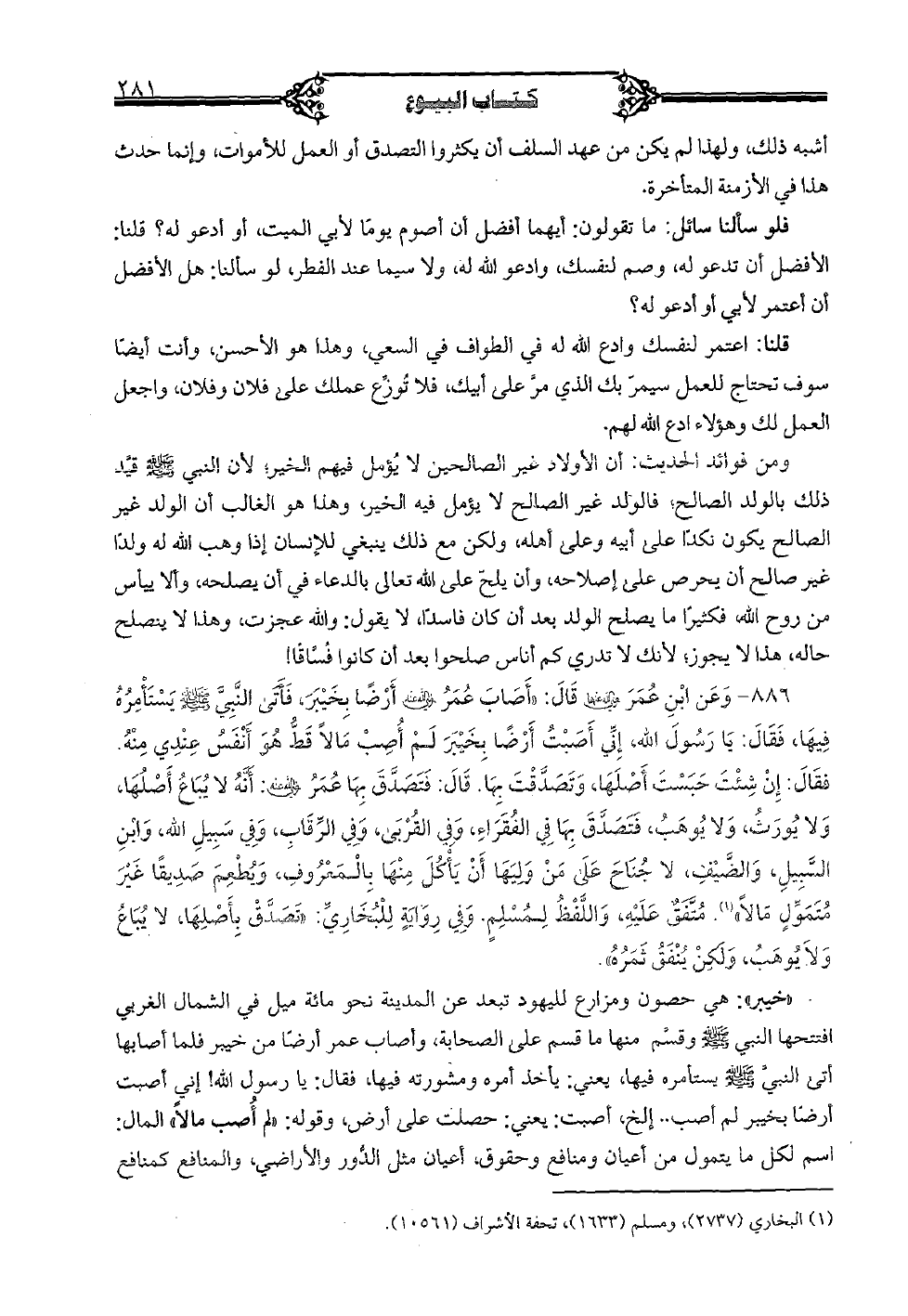 886 - وعن ابن عمر رضي الله عنه قال: «أصاب عمر رضي الله عنه أرضًا بخيبر، فأتى النبي صلى الله عليه وسلم يستأمره فيها، فقال: يا رسول الله، إني أصبت أرضًا بخير لم أصب مالاً قط هو أنفس عندي منه. فقال: إن شئت حبست أصلها، وتصدقت بها. قال: فتصدق بها عمر رضي الله عنه: أنه لا يباع أصلها، ولا يورث، ولا يوهب، فتصدق بها في الفقراء، وفي القربى، وفي الرقاب، وفي سبيل الله، وابن السبيل والضيف، لا جناح على من وليها أن يأكل منها بالمعروف، ويطعم صديقًا غير متمولٍ مالاً». متفق عليه، واللفظ لمسلمٍ. وفي روايةٍ للبخاري: «تصدق بأصلها، لا يباع ولا يوهب، ولكن ينفق ثمره».