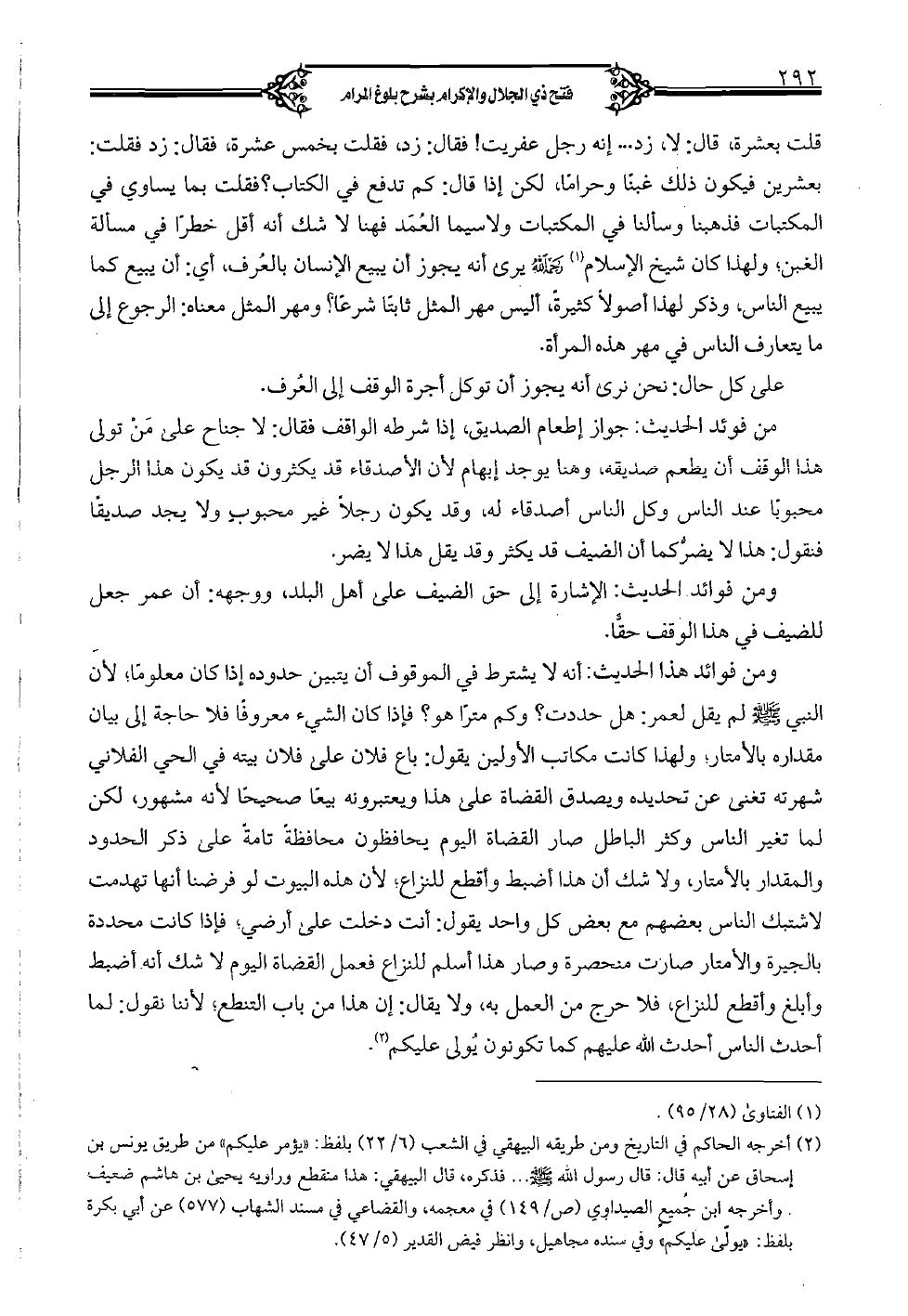 قلت بعشرة، قال: لا زد ... إنه رجل عفريت! فقال: زد، فقلت بخمس عشرة، فقال: زد فقلت: بعشرين فيكون ذلك غبناً وحراماً، لكن إذا قال: كم تدفع في الكتاب؟ فقلت بما يساوي في المكتبات فذهبنا وسألنا في المكتبات ولاسيما العمد فهنا لا شك أنه أقل خطراً في مسألة الغبن؛ ولهذا كان شيخ الإسلام-رحمه الله- يرى أنه يجوز أن يبيع الإنسان بالعرف، أي: أن يبيع كما يبيع الناس، وذكر لهذا أصولاً كثيرة، أليس مهر المثل ثابتاً شرعاً؟ ومهر المثل معناه: الرجوع إلى ما يتعارف الناس في مهر هذه المرأة.
