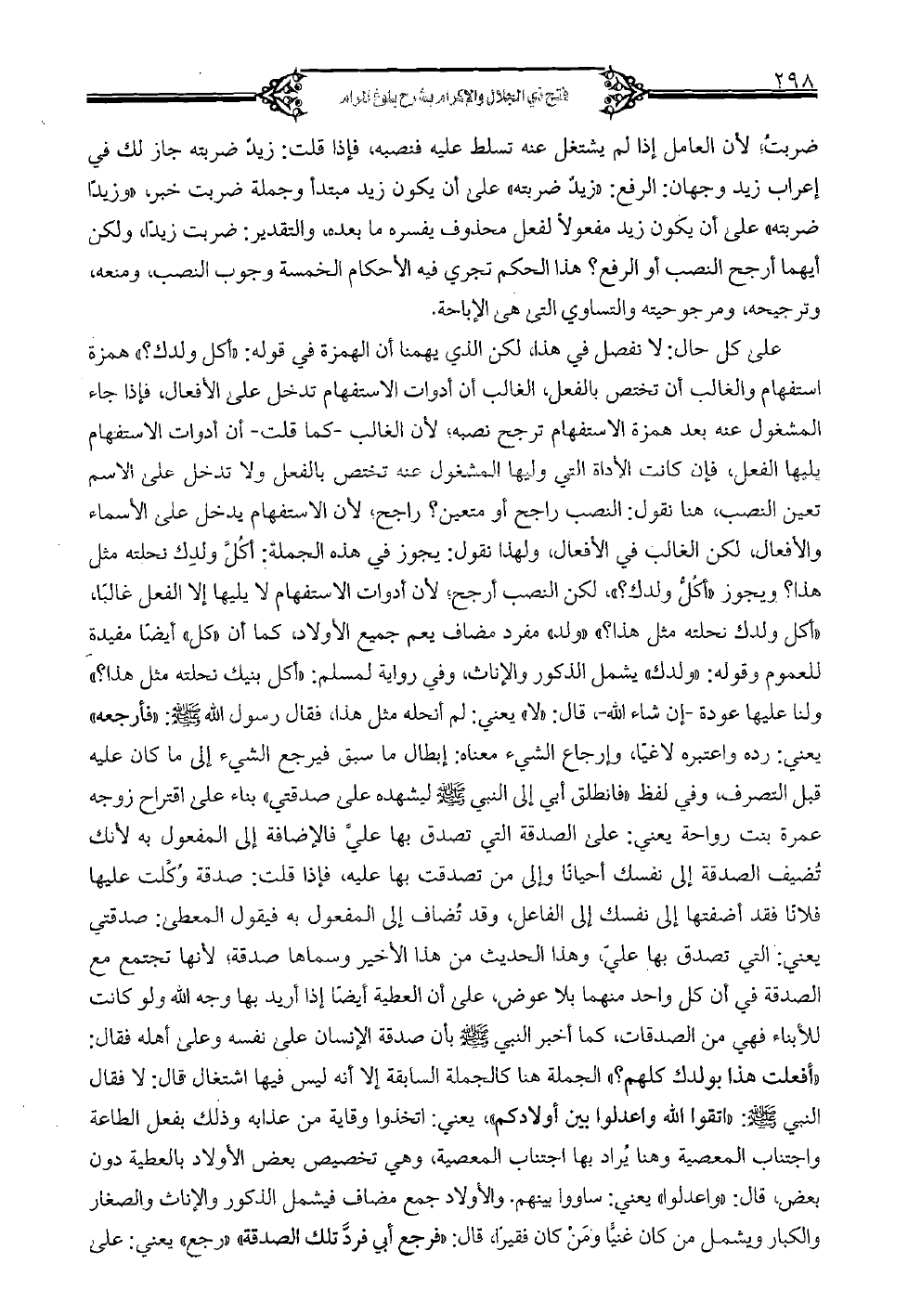 على كل حال: لا نفصل في هذا، لكن الذي يهمنا أن الهمزة في قوله: " أكل ولدك؟ " همزة استفهام والغالب أن تختص بالفعل، الغالب أن أدوات الاستفهام تدخل على الأفعال، فإذا جاء المشغول عنه بعد همزة الاستفهام ترجح نصبه، لأن الغالب -كما قلت- أن أدوات الاستفهام يليها الفعل، فإن كانت الأداة التي وليها المشغول عنه تختص بالفعل ولا تدخل على الاسم تعين النصب، وهنا نقول: النصب راجح أو متعين؟ راجح، لأن الاستفهام يدخل على الأسماء والأفعال، لكن الغالب في الأفعال، ولهذا نقول: يجوز في هذه الجملة: أكل ولدك نحلته مثل هذا؟ ويجوز "أكل ولدك؟ "، لكن النصب أرجح، لأن أدوات الاستفهام لا يليها إلا الفعل غالباً، "أكل ولدك نحلته مثل هذا؟ " "ولد" مفرد مضاف يعم جميع الأولاد، كما أن "كل" أيضاً مفيدة للعموم وقوله: "ولدك" يشمل الذكور والإناث، وفي رواية لمسلم: «أكل بنيك نحلته مثل هذا؟ » ولنا عليها عودة -إن شاء الله-، قال "لا" يعنى: لم أنحله مثل هذا، فقال رسول الله - صلى الله عليه وسلم - "فأرجعه" يعنى: رده واعتبره لاغياً، وإرجاع الشيء معناه: إبطال ما سبق فيرجع الشيء إلى ما كان عليه قبل التصرف، وفي لفظ «فانطلق أبى إلى النبي - صلى الله عليه وسلم - ليشهده على صدقتي» بناء على اقتراح زوجه عمرة بنت رواحة يعني: على الصدقة التي تصدق بها على فالإضافة إلى المفعول به لأنك تضيف الصدقة إلى نفسك أحياناً وإلى من تصدقت بها عليه، فإذا قلت: صدقة وكلت عليها فلاناً فقد أضفتها إلى نفسك إلى الفاعل، وقد تضاف إلى المفعول به فيقول المعطى: صدقتي يعني: التي تصدق بها على، وهذا الحديث من هذا الأخير وسماها صدقة، لأنها تجتمع مع الصدقة في أن كل واحد منهما بلا عوض، على أن العطية أيضاً إذا أريد بها وجه الله ولو كانت للأبناء فهي من الصدقات، كما أخبر النبي - صلى الله عليه وسلم - بأن صدقة الإنسان على نفسه وعلى أهله فقال: «أفعلت هذا بولدك كلهم؟ »، الجملة هنا كالجملة السابقة إلا أنه ليس فيها اشتغال قال: لا فقال النبي - صلى الله عليه وسلم -: «اتقوا الله واعدلوا بين أولادكم»، يعني: اتخذوا وقاية من عذابه وذلك بفعل الطاعة واجتناب المعصية وهنا يراد بها اجتناب المعصية، وهي تخصيص بعض الأولاد بالعطية دون بعض، قال: "واعدلوا" يعنى: ساووا بينهم. والأولاد جمع مضاف فيشمل الذكور والإناث والصغار ويشمل من كان غنياً ومن كان فقيراً، قال «فرجع أبي فرد تلك الصدقة» "رجع" يعني: على