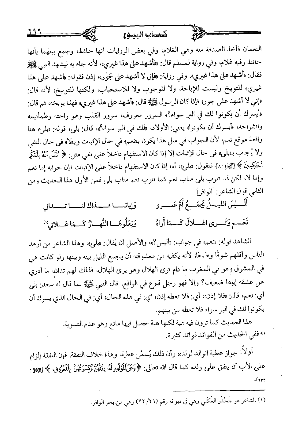 النعمان فأخذ الصدقة منه وهي الغلام، وفي بعض الروايات أنها حائط، وجمع بينهما بأنها حائط وفيه غلام، وفي رواية لمسلم قال: «فأشهد على هذا غيري»، لأنه جاء به ليشهد النبي-صلى الله عليه وسلم- «أشهد على هذا غيري»، وفي رواية: «فإني لا أشهد على جور»، إذن فقوله: «أشهد على هذا غيري» للتوبيخ وليست للإباحة، ولا للوجوب ولا للاستحباب، ولكنها للتوبيخ، لأنه قال: "إني لا أشهد على جور" فإذا كان الرسول -صلى الله عليه وسلم- قال: "أشهد على هذا غيري" فهذا يوبخه، ثم قال: «أيسرك أن يكونوا لك في البر سواء؟ » السرور معروف، سرور القلب وهو راحته وطمأنينته وانشراحه، "أيسرك أن يكونوا" يعنى: الأولاد، "لك في البر سواء؟ "، قال: "بلى" هنا واقعة موقع نعم، لأن الجواب في مثل هذا يكون "بنعم" في حال الإثبات إلا إذا كان الاستفهام داخلاً على نفي مثل: {أليس الله بأحكم الحاكمين} [التين: 8]. فنقول: "بلى"، أما إذا كان الاستفهام داخلاً على الإثبات فإن جوابه إما نعم وإما لا، لكن قد تنوب بلى مناب نعم كما تنوب نعم مناب بلى فمن الأول هذا الحديث ومن الثانى قول الشاعر: "الوافر":