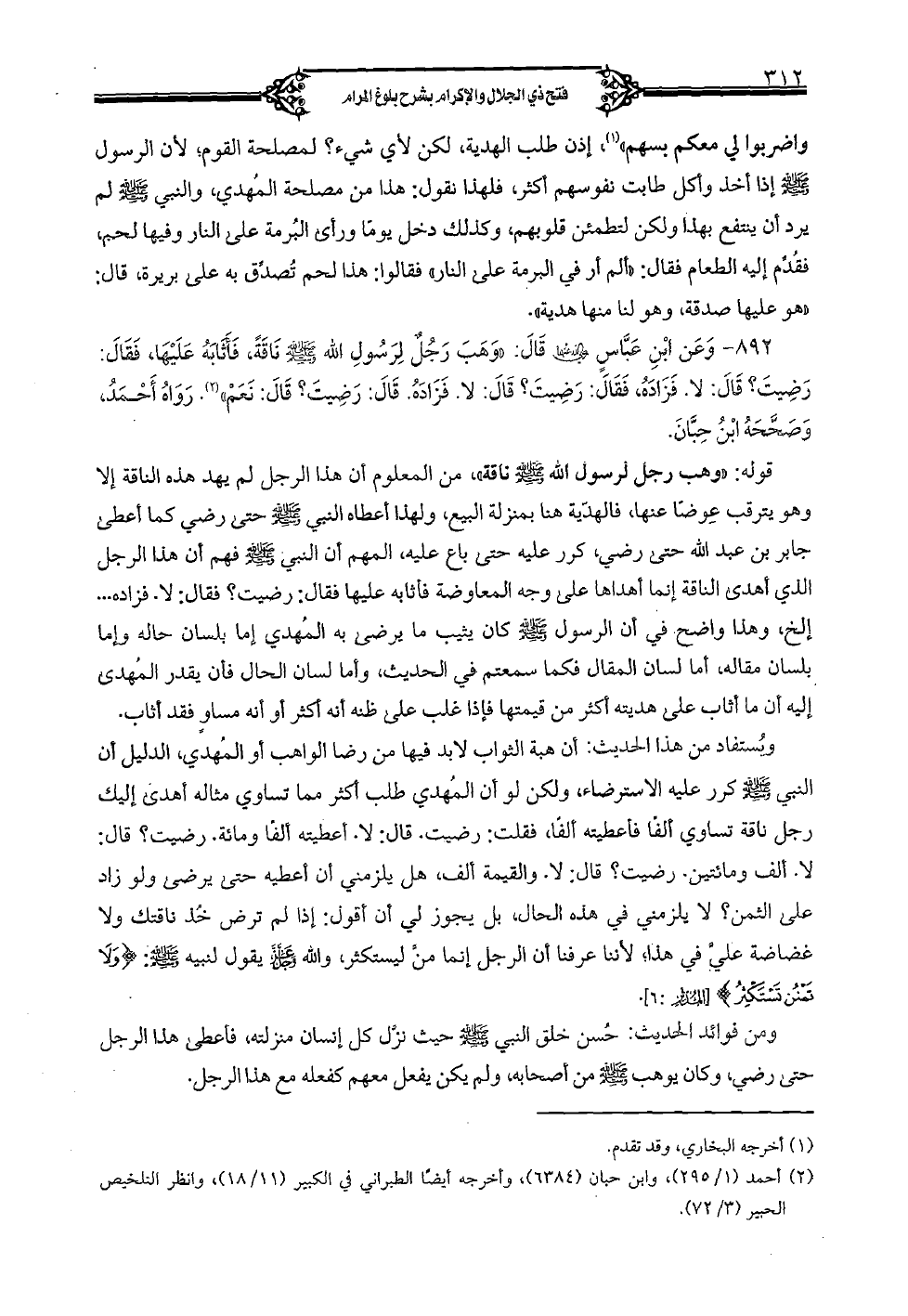 (892) - وَعَن ابن عَباس (رضي الله عنه) قَال: «وَهَبَ رَجُل لِرَسول الله (صلى الله عليه وسلم) نَاقَهُ، فأثابه عَلَيْهَا، فَقَالَ: رَضيتَ؟ قَالَ: لا، فزاده، فَقَالَ: رَضيتَ؟ قَالَ: لا فزاده، قَالَ: رَضيتَ؟ قَالَ: نعم». رَوَاهُ أَحْمَد، وصححه ابنُ حِبَّانَ.