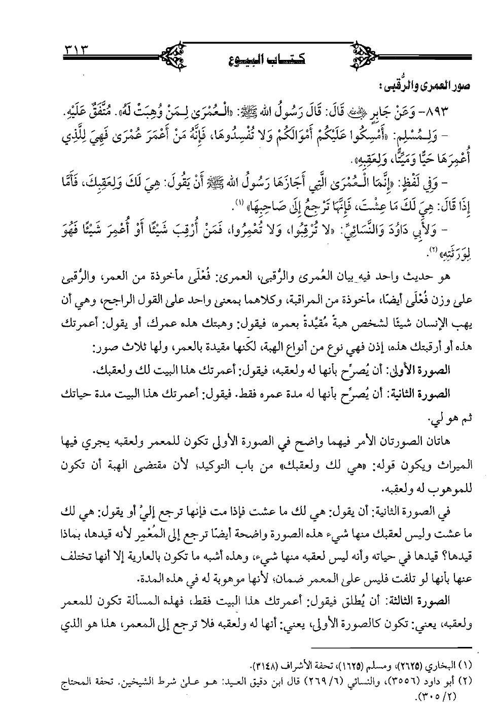 (893) - وَعَن جابر (رضي الله عنه) قال: قال رَسول الله (صلى الله عليه وسلم): «العُمرى لِمنْ وهبَتْ لَهُ». مُتفق عليه.