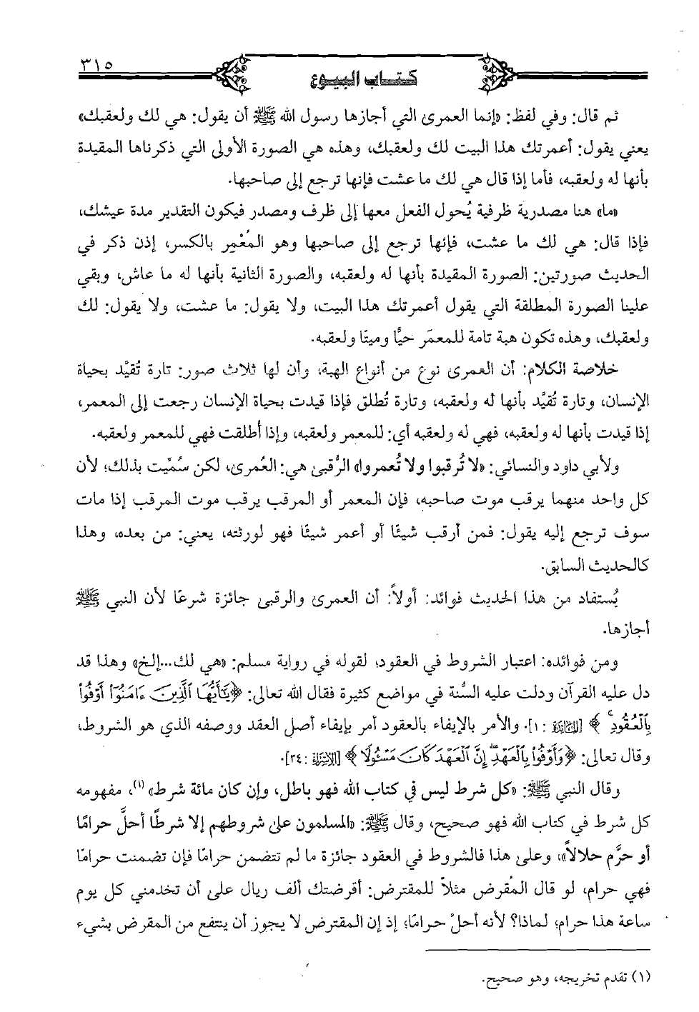 وقال النبي (صلى الله عليه وسلم): «كل شرط ليس في كتاب الله فهو باطل، وإن كان مائة شرطه»، مفهومه كل شرط في كتاب الله فهو صحيح، وقال (صلى الله عليه وسلم): «المسلمون على شروطهم إلا شرطا أحلّ حرامًا أو حرّم حلالاً»، وعلى هذا فالشروط في العقود جائزة ما لم تتضمن حرامًا فإن تضمنت حرامًا فهي حرام، لو قال المقرض مثلاً للمقترض: أقرضتك ألف ريال على أن تخدمني كل يوم ساعة هذا حرام، لماذا؟ لأنه أحل حرامًا، إذ إن المقترض لا يجوز أن ينتفع من المقرض بشيء