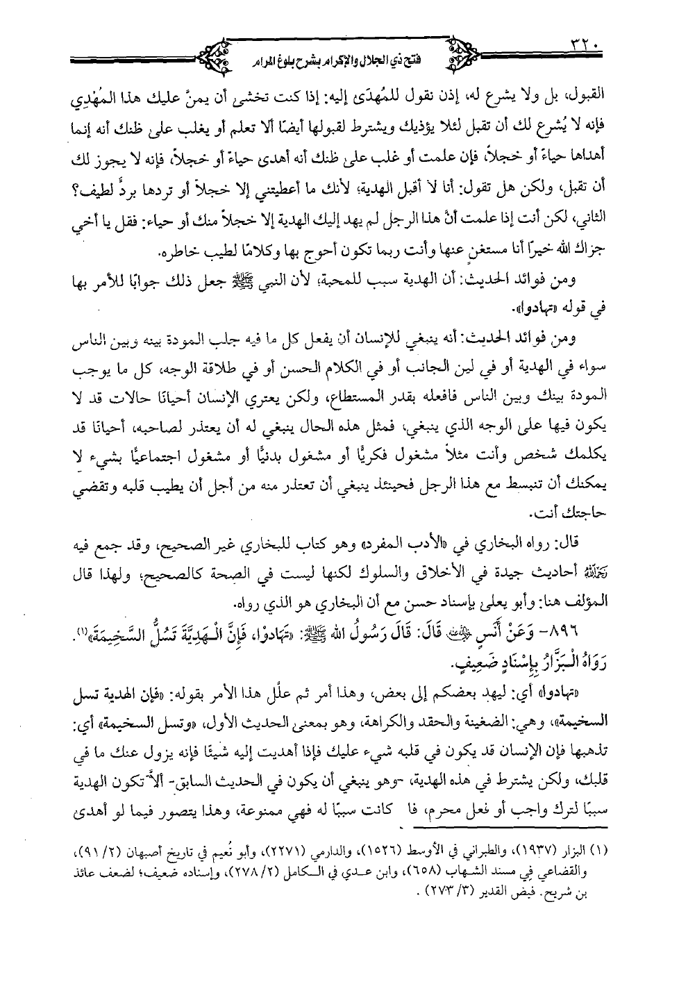 ? ? ? - وعن أنس (رضي الله عنه) قال: قال رسول الله (صلى الله عليه وسلم): «تهادوا، فإن الهدية تَسُلُّ السخيمةَ». رواه البزار بإسناد ضعيف.