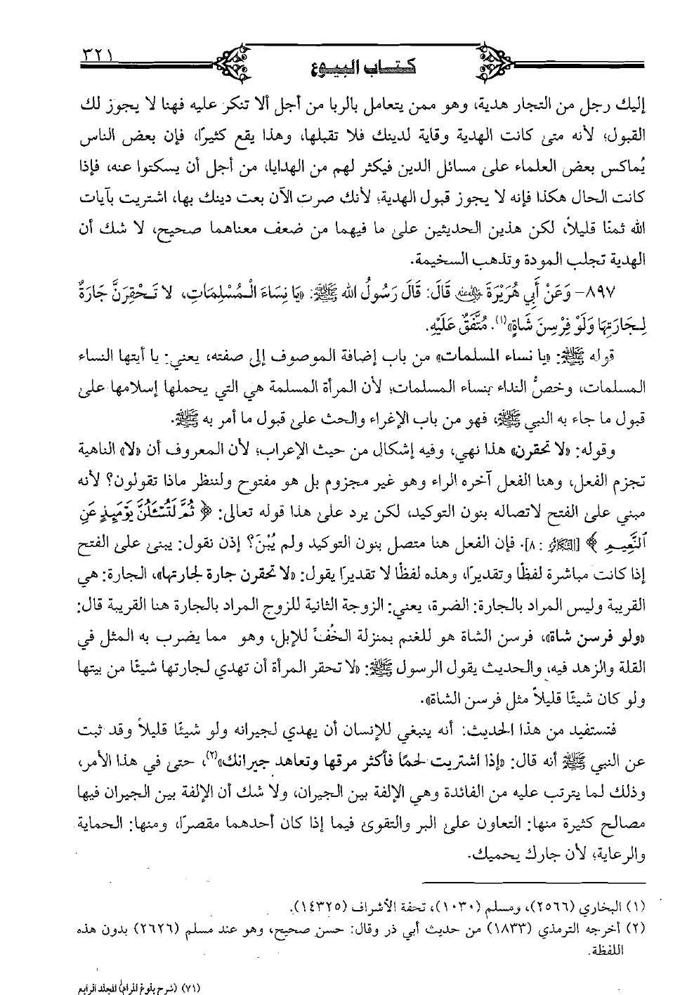 وقوله: «لا تحقرن»، هذا نهي، وفيه إشكال من حيث الإعراب؛ لأن المعروف أن «لا» الناهية تجزم الفعل، وهنا الفعل آخره الراء وهو غير مجزوم بل هو مفتوح ولننظر ماذا تقولون؟ لأنه مبني على الفتح لاتصاله بنون التوكيد، لكن يرد على هذا قوله تعالى: {ثُمّ لَتُسْأَلُنّ يَوْمَئِذٍ عَنِ النّعِيمِ} [التكاثر: 8]. فإن الفعل هنا متصل بنون التوكيد ولم يُبْنَ؟ إذن نقول: يبنى على الفتح إذا كانت مباشرة لفظا وتقديرا، وهذه لفظا لا تقديرا يقول: «لا تحقرن جارة لجارتها»، الجارة: هي القريبة وليس المراد بالجارة: الضرة، يعني: الزوجة الثانية للزوج المراد بالجارة هنا القريبة قال: «ولو فرسن شاة»، فرسن الشاة هو للغنم بمنزلة الخف للإبل، وهو مما يضرب به المثل في القلة والزهد فيه، والحديث يقول الرسول (صلى الله عليه وسلم): «لا تحقر المرأة أن تهدي لجارتها شيئا من بيتها ولو كان شيئا قليلاً مثل فرسن الشاة».