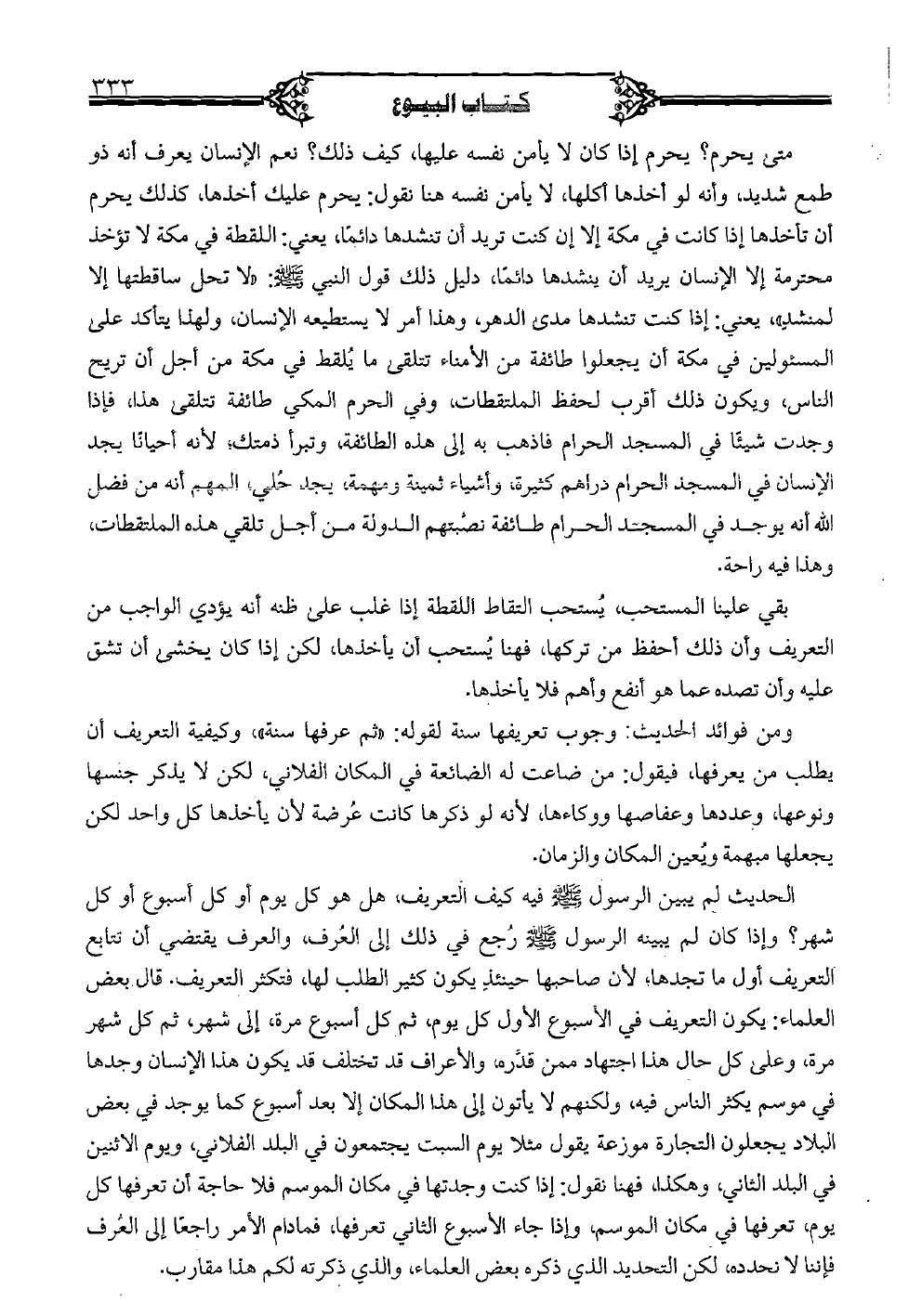 متى يحرم؟ يحرم إذا كان لا يأمن نفسه عليها، كيف ذلك؟ نعم الإنسان يعرف أنه ذو طمع شديد، وأنه لو أخذها أكلها، لا يأمن نفسه هنا نقول: يحرم عليك أخذها، كذلك يحرم أن تأخذها إذا كانت في مكة إلا إن كنت تريد أن تنشدها دائمًا، يعني: اللقطة في مكة لا تؤخذ محترمة إلا الإنسان يريد أن ينشدها دائمًا، دليل ذلك قول النبي (صلى الله عليه وسلم): «لا تحل ساقطتها إلا لمنشدٍ»، يعني: إذا كنت تنشدها مدى الدهر، وهذا أمر لا يستطيعه الإنسان، ولهذا يتأكد على المسئولين في مكة أن يجعلوا طائفة من الأمناء تتلقى ما يُلقط في مكة من أجل أن تريح الناس، ويكون ذلك أقرب لحفظ الملتقطات، وفي الحرم المكي طائفة تتلقى هذا، فإذا وجدت شيئا في المسجد الحرام فاذهب به إلى هذه الطائفة، وتبرأ ذمتك، لأنه أحيانا يجد الإنسان في المسجد الحرام دراهم كثيرة، وأشياء ثمينة ومهمة، يجد حُلي، المهم أنه من فضل الله أنه يوجد في المسجد الحرام طائفة نصبتهم الدولة من أجل تلقي هذه الملتقطات، وهذا فيه راحة.
