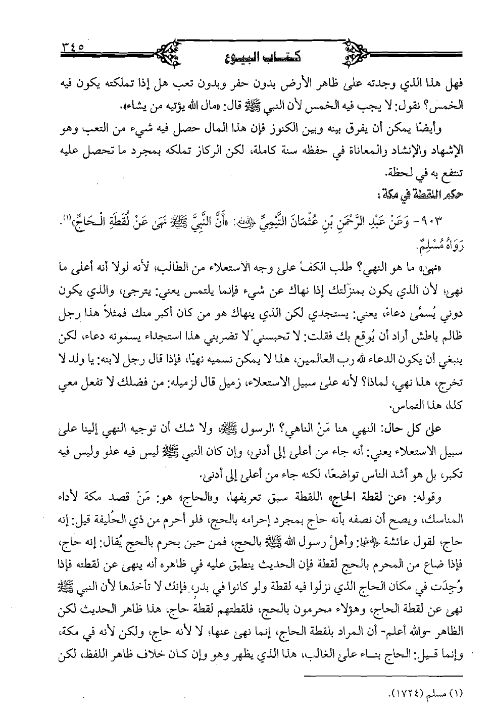 (903) - وعن عبد الحمن بن عثمان التيمي (رضي الله عنه): «أن النبي (صلى الله عليه وسلم) نهى عن لقطة الحاج». رواه مسلم.