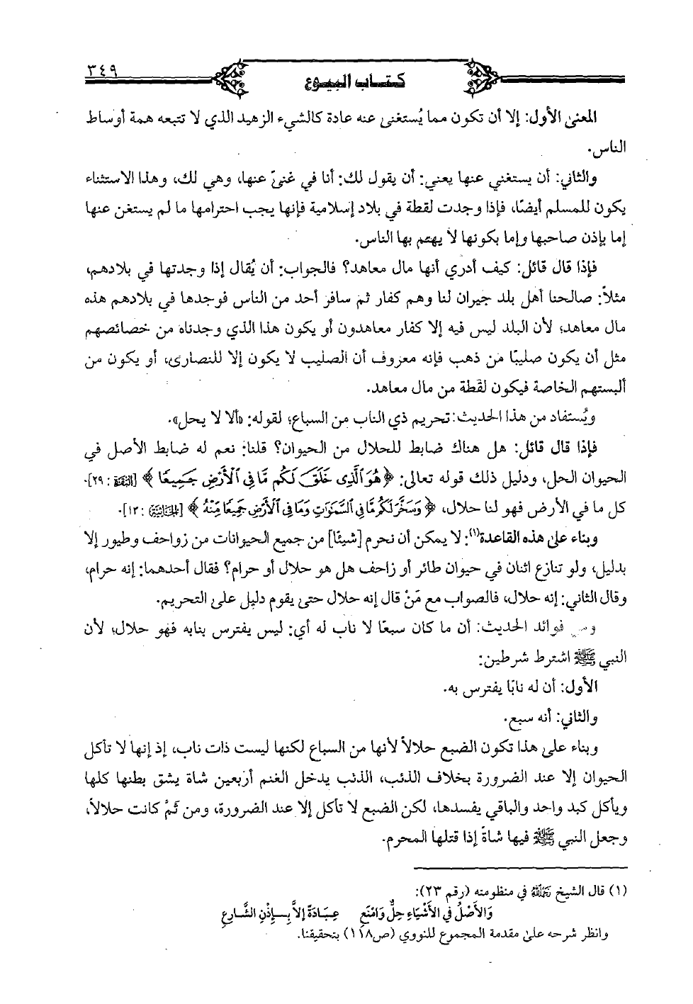 وبناء على هذا تكون الضبع حلالاً لأنها من السباع لكنها ليست ذات ناب، إذ إنها لا تأكل الحيوان إلا عند الضرورة بخلاف الذئب، الذئب يدخل الغنم أربعين شاة يشق بطنها كلها ويأكل كبد واحد والباقي يفسدها، لكن الضبع لا تأكل إلا عند الضرورة، ومن ثم كانت حلالاً، وجعل النبي (صلى الله عليه وسلم) فيها شاة إذا قتلها المحرم.