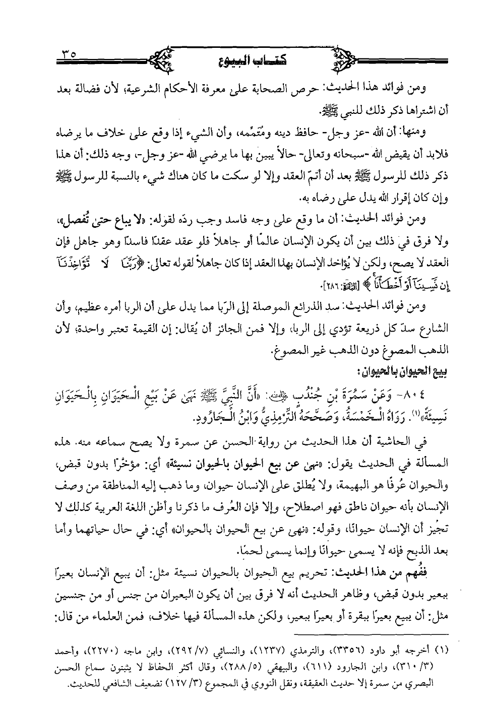في الحاشية أن هذا الحديث من رواية الحسن عن سمرة ولا يصح سماعه منه. هذه المسألة في الحديث يقول: «نهى عن بيع الحيوان بالحيوان نسيئة» أي: مؤخرا بدون قبض، والحيوان عرفاً هو البهيمة، ولا يطلق على الإنسان حيوان، وما ذهب إليه المناطقة من وصف الإنسان بأنه حيوان ناطق فهو اصطلاح، وإلا فإن العرف ما ذكرنا وأظن اللغة العربية كذلك لا تجيز أن الإنسان حيواناً، وقوله: «نهى عن بيع الحيوان بالحيوان» أي: في حال حياتهما وأما بعد الذبح فإنه لا يسمى حيواناً وإنما يسمى لحماً.