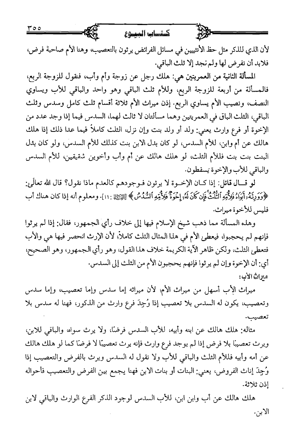 المسألة الثانية من العمريتين هي: هلك رجل عن زوجة وأم وأب، فنقول للزوجة الربع، فالمسألة من أربعة للزوجة الربع، وللأم ثلث الباقي وهو واحد والباقي للأب ويساوي النصف، ونصيب الأم يساوي الربع. إذن ميراث الأم ثلاثة أقسام ثلث كامل وسدس وثلث الباقي، الثلث الباق في العمريتين وهما مسألتان لا ثالث لهما، السدس فيما إذا وجد عدد من الإخوة أو فرع وارث يعني: ولد أو ولد بنت وإن نزل، الثلث كاملاً فيما عدا ذلك إذا هلك هالك عن أم وابن، للأم السدس، لو كان بدل الابن بنت كذلك للأم السدس، ولو كان بدل البنت بنت بنت فللأم الثلث، لو هلك هالك عن أم وأب وأخوين شقيقين، للأم السدس والباقي للأب والإخوة يسقطون.