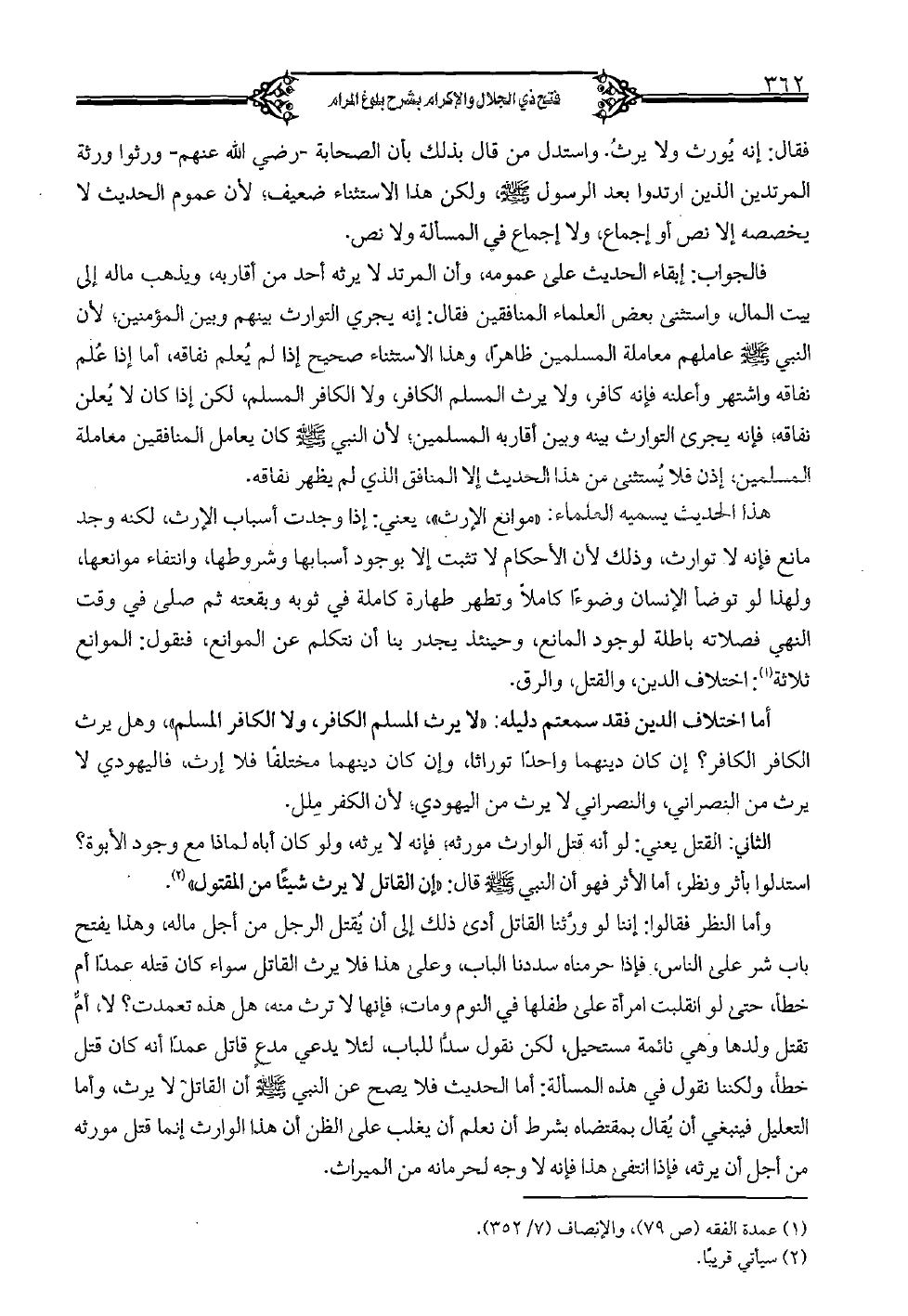 فقال: إنه يورث ولا يرث. واستدل من قال بذلك بأن الصحابة (رضى الله عنهم) ورثوا ورثة المرتدين الذين ارتدو بعد الرسول (صلى الله عليه وسلم)، ولكن هذا الاستثناء ضعيف، لأن عموم الحديث لا يخصصه إلا بنص أو بإجماع، ولا إجماع في المسألة ولا نص.