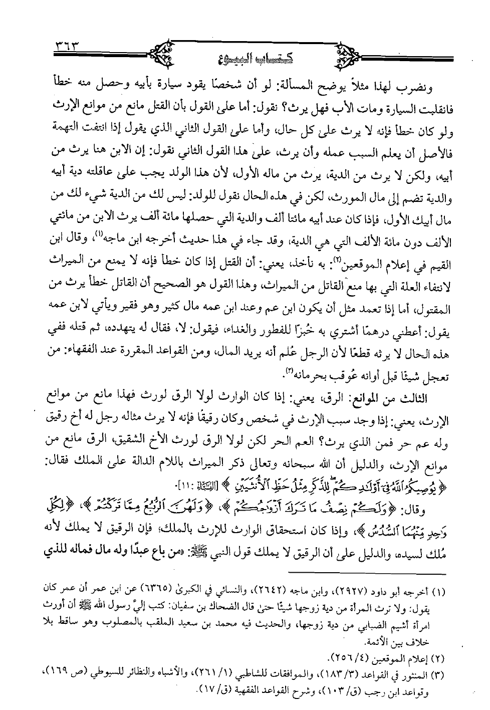 الثالث من الموانع: الرق، يعني: إذا كان الوارث لولا الرق لورث فهذا مانع من موانع الإرث، يعني: إذا وجد سبب الإرث في شخص وكان رقيقا فإنه لا يرث مثاله رجل له أخ رقيق. وله عم حر فمن الذي يرث؟ العم الحر لكن لولا الرق لورث الأخ الشقيق، الرق مانع من موانع الإرث، والدليل أن الله سبحانه وتعالى ذكر الميراث باللام الدالة على الملك فقال: : {يُوصِيكُمُ اللَّهُ فِي أَوْلَادِكُمْ لِلذَّكَرِ مِثْلُ حَظِّ الْأُنثَيَيْنِ} [النساء: 11].