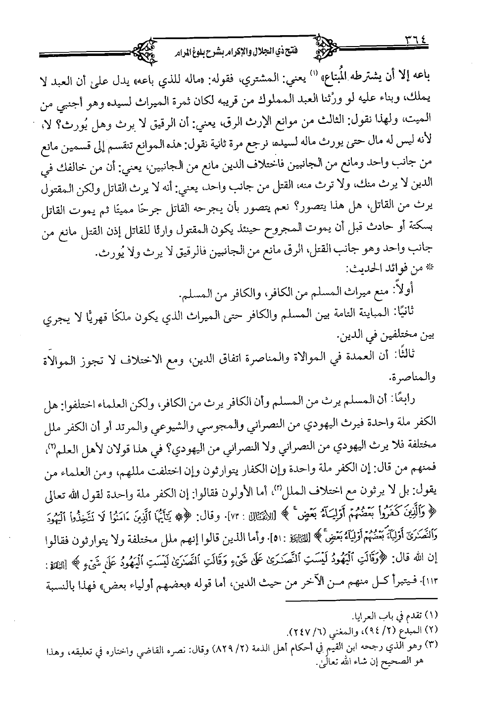 رابعًا: أن المسلم يرث من المسلم وأن الكافر يرث من الكافر، ولكن العلماء اختلفوا: هل الكفر ملة واحدة فيرث اليهودي من النصراني والمجوسي والشيوعي والمرتد أو أن الكفر ملل مختلفة فلا يرث اليهودي من النصراني ولا النصراني من اليهودي؟ في هذا قولان لأهل العلم، فمنهم من قال: إن الكفر ملة واحدة وإن الكفار يتوارثون وإن اختلفت مللهم، ومن العلماء من يقول: بل لا يرثون مع اختلاف الملل، أما الأولون فقالوا: إن الكفر ملة واحدة لقول الله تعالى {وَالَّذِينَ كَفَرُوا بَعْضُهُمْ أَوْلِيَاءُ بَعْض} [الأنفال: 73]. وقال: {يَا أَيُّهَا الَّذِينَ آمَنُوا لَا تَتَّخِذُوا الْيَهُودَ وَالنَّصَارَى أَوْلِيَاءَ بَعْضُهُمْ أَوْلِيَاءُ} [المائدة: 51]. وأما الذين قالوا لهم ملل مختلفة ولا يتوارثون فقالوا إن الله قال: {وَقَالَتِ الْيَهُودُ لَيْسَتِ النَّصَارَى عَلَى شَيْءٍ وَقَالَتِ النَّصَارَى لَيْسَتِ الْيَهُودُ عَلَى شَيْءٍ} [المائدة: 112]. فيتبرأ كل منهم من الآخر من حيث الدين، أما قوله «بعضهم أولياء بعض» فهذا بالنسبة