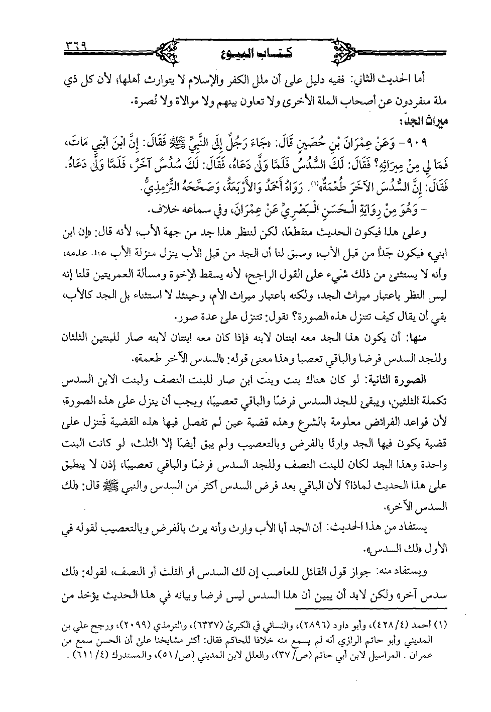909 - وعن عمران بن حصين قال: «جاء رجل إلى النبي (صلى الله عليه وسلم) فقال: إن ابن ابني مات، فما لي من ميراثه؟ فقال: لك السدس فلما ولى دعاه، فقال: لك سدس آخر، فلما ولى دعاه. فقال: إن السدس الآخر طُعمةٌ». رواه أحمد والأربعة، وصححه الترمذي.
