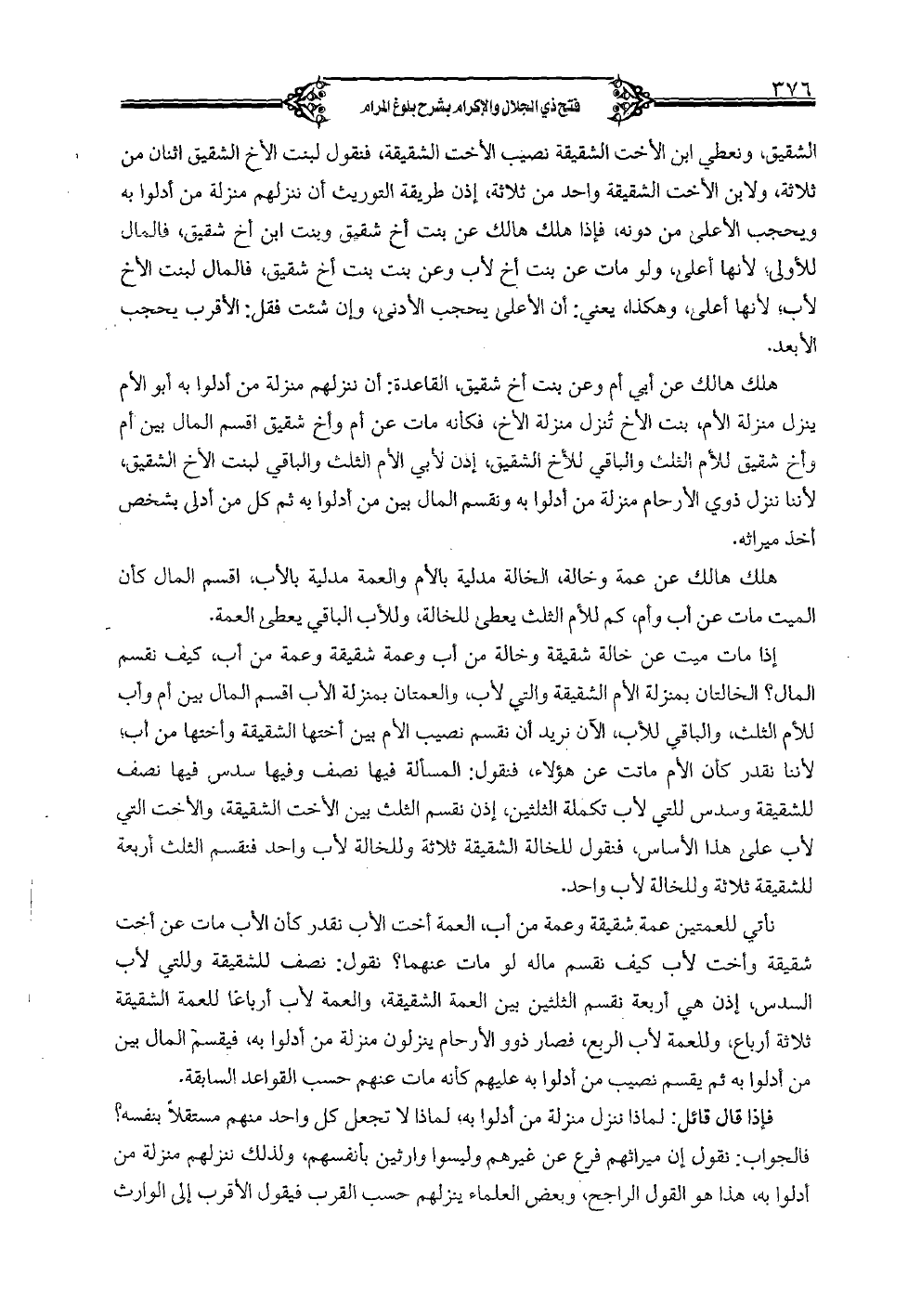 الشقيق، ونعطي ابن الأخت الشقيقة نصيب الأخت الشقيقة، فنقول لبنت الأخ الشقيق اثنان من ثلاثة، ولابن الأخت الشقيقة واحد من ثلاثة، إذن طريقة التوريث أن ننزلهم منزلة من أدلوا به ويحجب الأعلى من دونه، فإذا هلك هالك عن بنت أخ شقيق وينت ابن أخ شقيق، فالمال للأولى؛ لأنها أعلى، ولو مات عن بنت أخ لأب وعن بنت بنت أخ شقيق، فالمال لبنت الأخ لأب؛ لأنها أعلى، وهكذا، يعنى: أن الأعلى يحجب الأدنى، وإن شئت فقل: الأقرب يحجب الأبعد.
