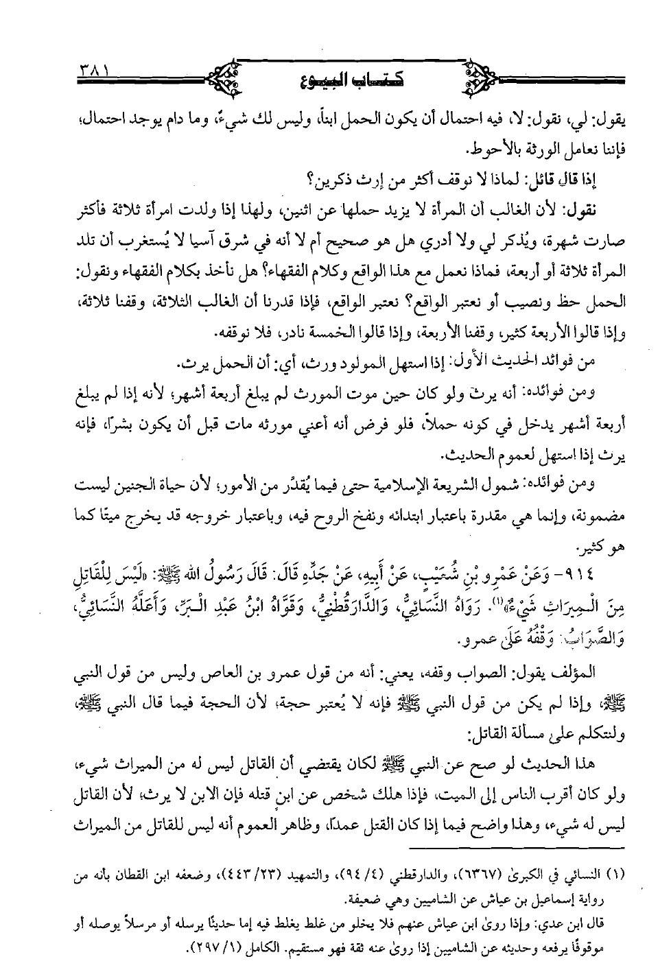 المؤلف يقول: الصواب وقفه، يعني أنه من قول عمرو بن العاص وليس من قول النبي (صلى الله عليه وسلم)، وإذا لم يكن من قول النبي (صلى الله عليه وسلم) فإنه لا يعتبر حجة؛ لأن الحجة فيما قال النبي (صلى الله عليه وسلم) ولنتكلم على مسألة القاتل:
