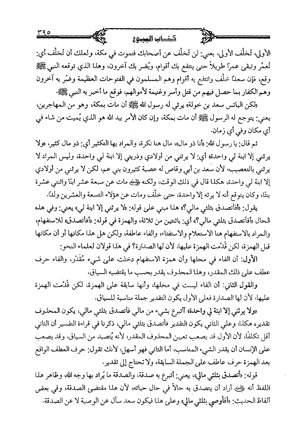 يقول: «أفأتصدق بثلثي مالي؟ » هذا مبني على قوله: «لا يرثني إلا ابنة لي» يعني: وفي هذه الحال «أفأتصدق بثلثي مالي؟ » أي: باثنتين من ثلاثة، والهمزة في قوله: «أفأتصدق» للاستفهام، والمراد بالاستفهام هنا الاستعلام والاستفتاء، والفاء عاطفة، ولكن هل هذا مكانها أو أن مكانها قبل الهمزة، لكن قُدمت الهمزة عليها؛ لأن لها الصدارة؟ في هذا قولان لعلماء النحو: