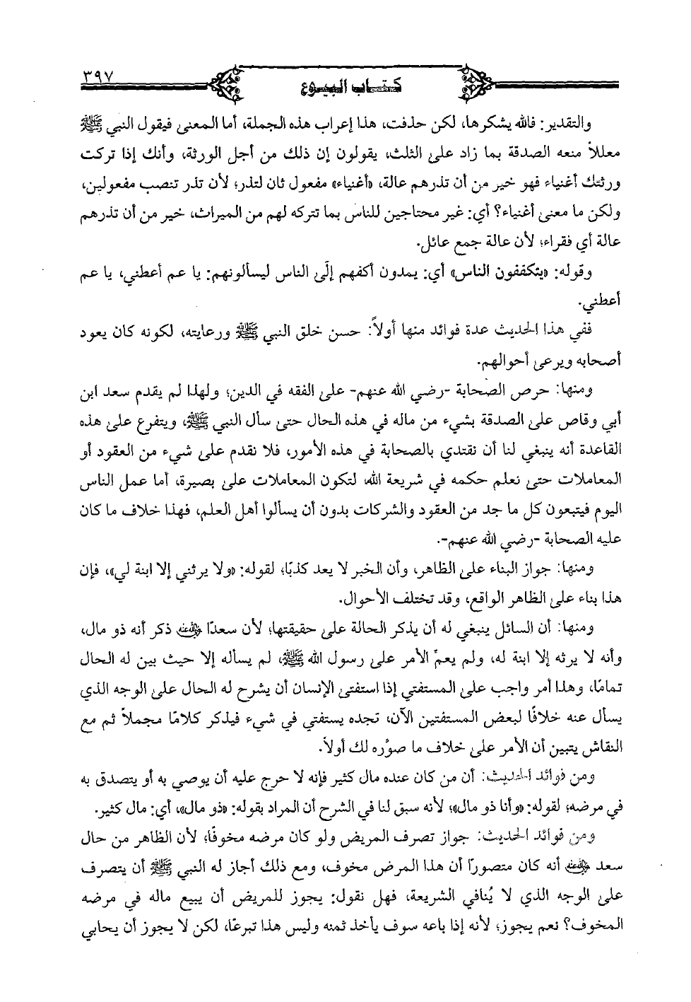 ومن فوائد الحديث: جواز تصرف المريض ولو كان مرضه مخوفا؛ لأن الظاهر من حال سعد (رضي الله عنه) أنه كان متصورا أن هذا المرض مخوف، ومع ذلك أجاز له النبي (صلى الله عليه وسلم) أن يتصرف على الوجه الذي لا ينافي الشريعة، فهل نقول: يجوز للمريض أن يبيع ماله في مرضه المخوف؟ نعم يجوز؛ لأنه إذا باعه سوف يأخذ ثمنه وليس هذا تبرعا، لكن لا يجوز أن يحابي