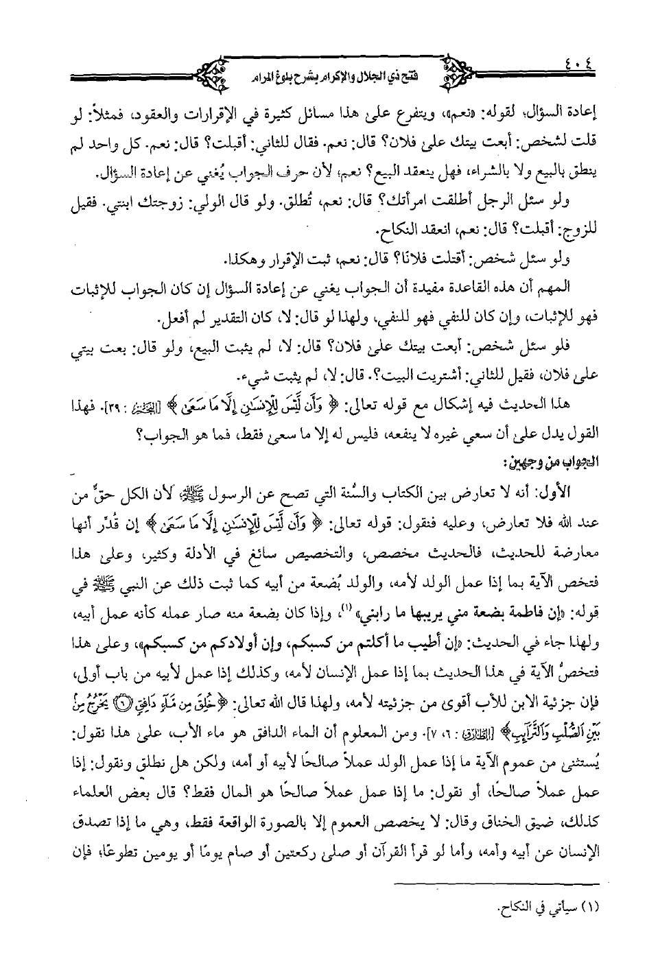 الأول: أنه لا تعارض بين الكتاب والسُنة التي تصح عن الرسول (صلى الله عليه وسلم)؛ لأن الكل حقٌ من عند الله فلا تعارض، وعليه فيقول: قوله تعالى: {وَأَنْ لَيْسَ لِلْإِنْسَانِ إِلَّا مَا سَعَى} [النجم: 39] إن قُدر أنها معارضة للحديث، فالحديث مخصص، والتخصيص سائغ في الأدلة وكثير، وعلى هذا فتخص الآية بما إذا عمل الولد لأمه، والولد بُضعة من أبيه كما ثبت ذلك عن النبي (صلى الله عليه وسلم) في قوله: «إن فاطمة بضعة مني يريبها ما رابني»، وإذا كان بضعة منه صار عمله كأنه عمل أبيه، ولهذا جاء في الحديث: «إن أطيب ما أكلتم من كسبكم، وإن أولادكم من كسبكم» وعلى هذا فتخصُّ الآية في هذا الحديث بما إذا عمل الإنسان لأمه، وكذلك إذا عمل لأبيه من باب أولى، فإن جزئية الابن للأب أقوى من جزئيته لأمه، ولهذا قال الله تعالى: {خُلِقَ مِن ماء دَافِقٍ يَخْرُجُ مِن بَيْنِ الصلب وَالتَّرَائِبِ} [الطارق: 6، 7].