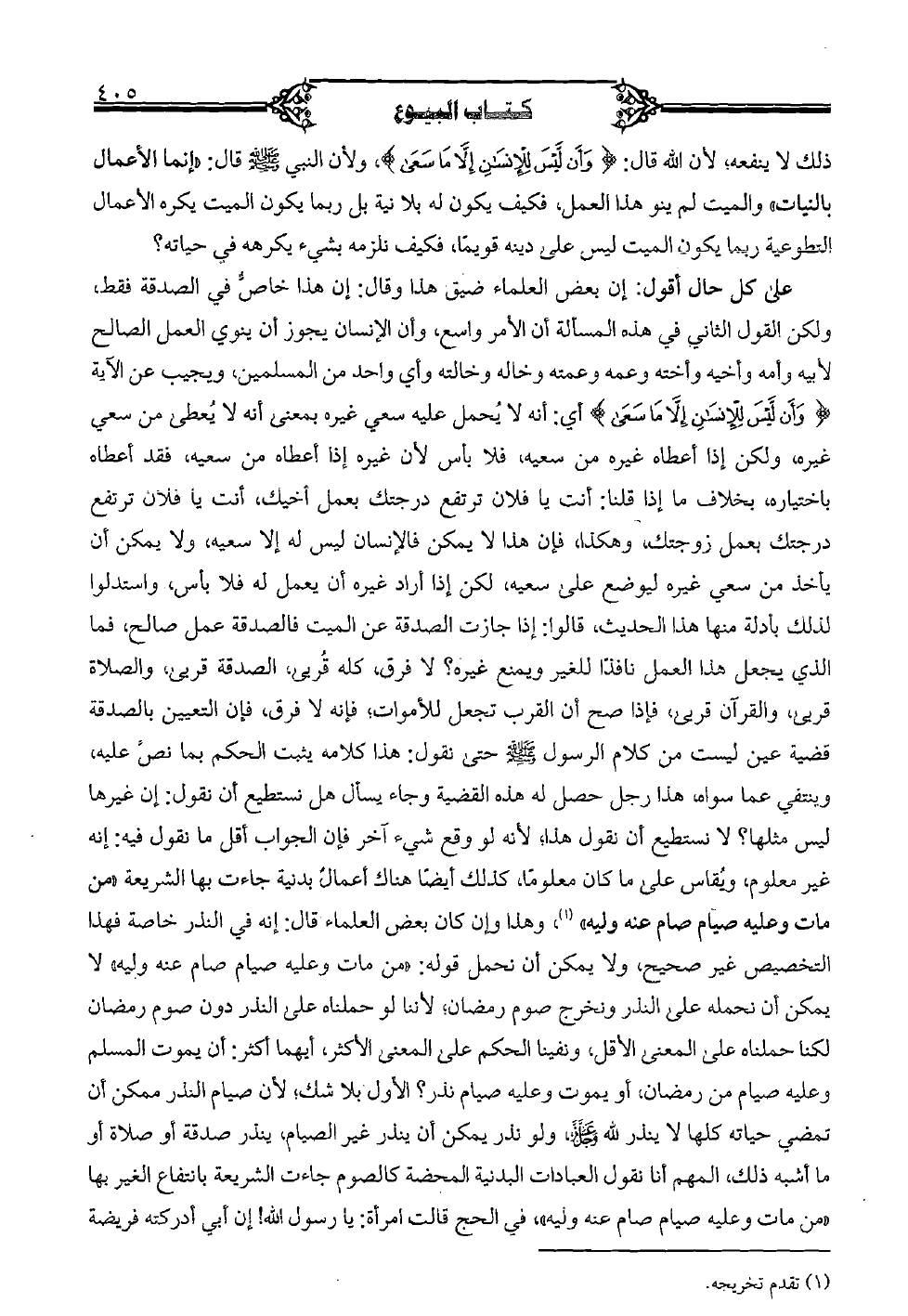 على كل حال أقول: إن بعض العلماء ضيق هذا وقال: إن هذا خاص في الصدقة فقط، ولكن القول الثاني في هذه المسألة أن الأمر واسع، وأن الإنسان يجوز أن ينوي العمل الصالح لأبيه وأمه وأخيه وأخته وعمه وعمته وخاله وخالته وأي واحد من المسلمين، ويجيب عن الآية {وَأَنْ لَيْسَ لِلْإِنْسَانِ إِلَّا مَا سَعَى} [النجم: 39] أي: أنه لا يُحمل عليه سعي غيره بمعنى أنه لا يُعطى من سعي غيره، ولكن إذا أعطاه غيره من سعيه، فلا بأس لأن غيره إذا أعطاه من سعيه، فقد أعطاه باختياره، بخلاف ما إذا قلنا: أنت يا فلان ترتفع درجتك بعمل أخيك، أنت يا فلان ترتفع درجتك بعمل زوجتك، وهكذا، فإن هذا لا يمكن فالإنسان ليس له إلا سعيه، ولا يمكن أن يأخذ من سعي غيره ليوضع على سعيه، لكن إذا أراد غيره أن يعمل له فلا بأس، واستدلوا لذلك بأدلة منها هذا الحديث، قالوا: إذا جازت الصدقة عن الميت فالصدقة عمل صالح، فما الذي يجعل هذا العمل نافذًا للغير ويمنع غيره؟ لا فرق، كله قُربى، الصدقة قربى، والصلاة قربى، والقرآن قربى، فإذا صح أن القرب تجعل للأموات؛ فإنه لا فرق، فإن التعيين بالصدقة قضية عين ليست من كلام الرسول (صلى الله عليه وسلم) حتى نقول: هذا كلامه يثبت الحكم بما نصَّ عليه، وينتفي عما سواه، هذا رجل حصل له هذه القضية وجاء يسأل هل نستطيع أن نقول: إن غيرها ليس مثلها؟ لا نستطيع أن نقول هذا، لأنه لو وقع شيء آخر فإن الجواب أقل ما نقول فيه: إنه غير معلوم، ويُقاس على ما كان معلومًا، كذلك أيضا هناك أعمالٌ بدنية جاءت بها الشريعة «من مات وعليه صيام صام عنه وليه»، وهذا وإن كان بعض العلماء قال: إنه في النذر خاصة فهذا التخصيص غير صحيح، ولا يمكن أن نحمل قوله: «من مات وعليه صيام صام عنه وليه» لا يمكن أن نحمله على النذر ونخرج صوم رمضان، لأننا لو حملناه على النذر دون صوم رمضان لكنا حملناه على المعنى الأقل، ونفينا الحكم على المعنى الأكثر، أيهما أكثر: أن يموت المسلم وعليه صيام من رمضان، أو يموت وعليه صيام نذر؟ الأول بلا شك، لأن صيام النذر ممكن أن تمضي حياته كلها لا ينذر لله (عز وجل)، ولو نذر يمكن أن ينذر غير الصيام، ينذر صدقة أو صلاة أو ما أشبه ذلك، المهم أنا نقول العبادات البدنية المحضة كالصوم جاءت الشريعة بانتفاع الغير بها «ومن مات وعليه صيام صام عنه وليه»، في الحج قالت امرأة: يا رسول الله! إن أبي أدركته فريضة