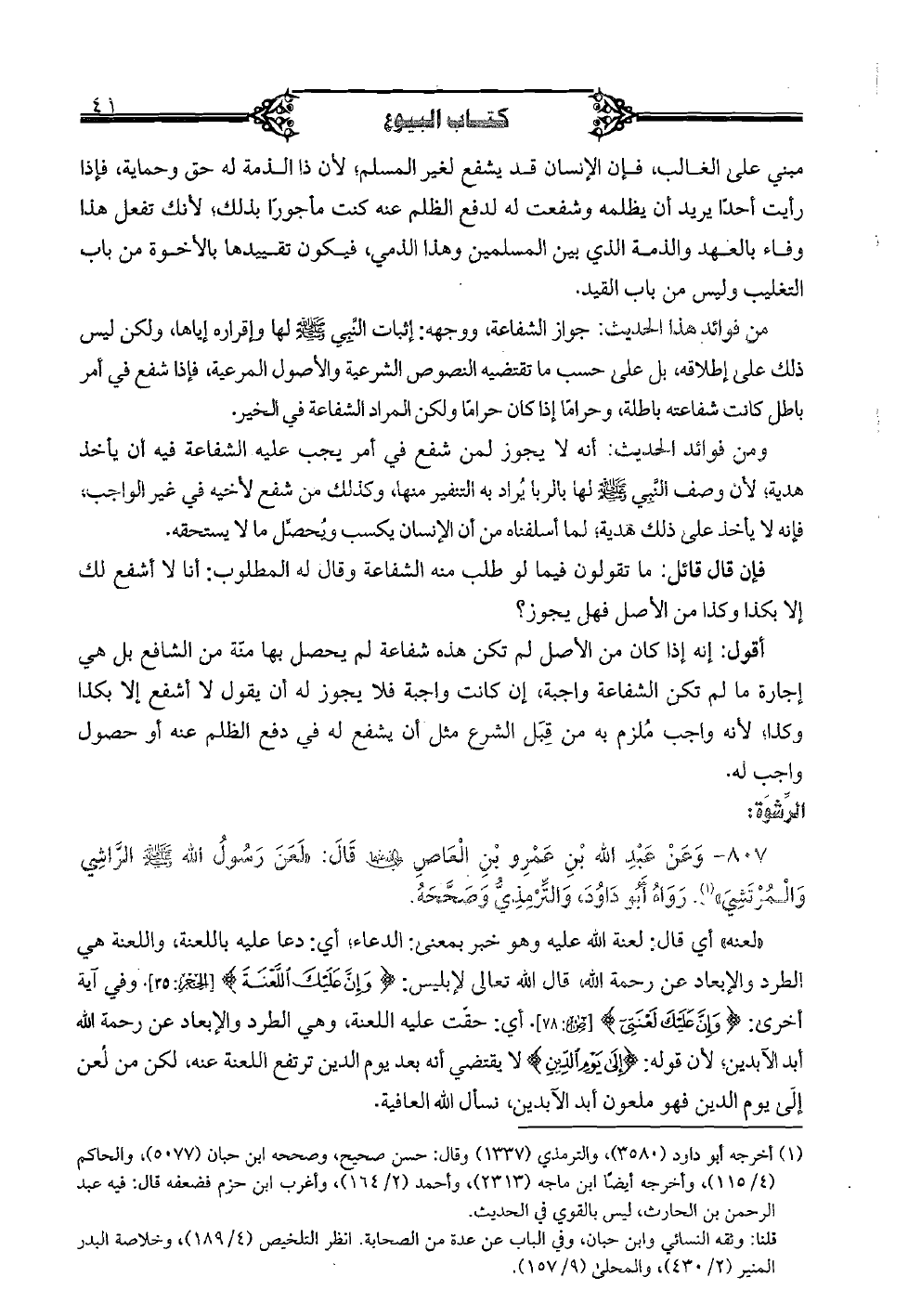 807 - وعن عبد الله بن عمر بن العاص رضي الله عنهما قال: "لعن رسول الله صلى الله عليه وسلم الراشي والمرتشي". رواه أبو داود، والترمذي وصححه.