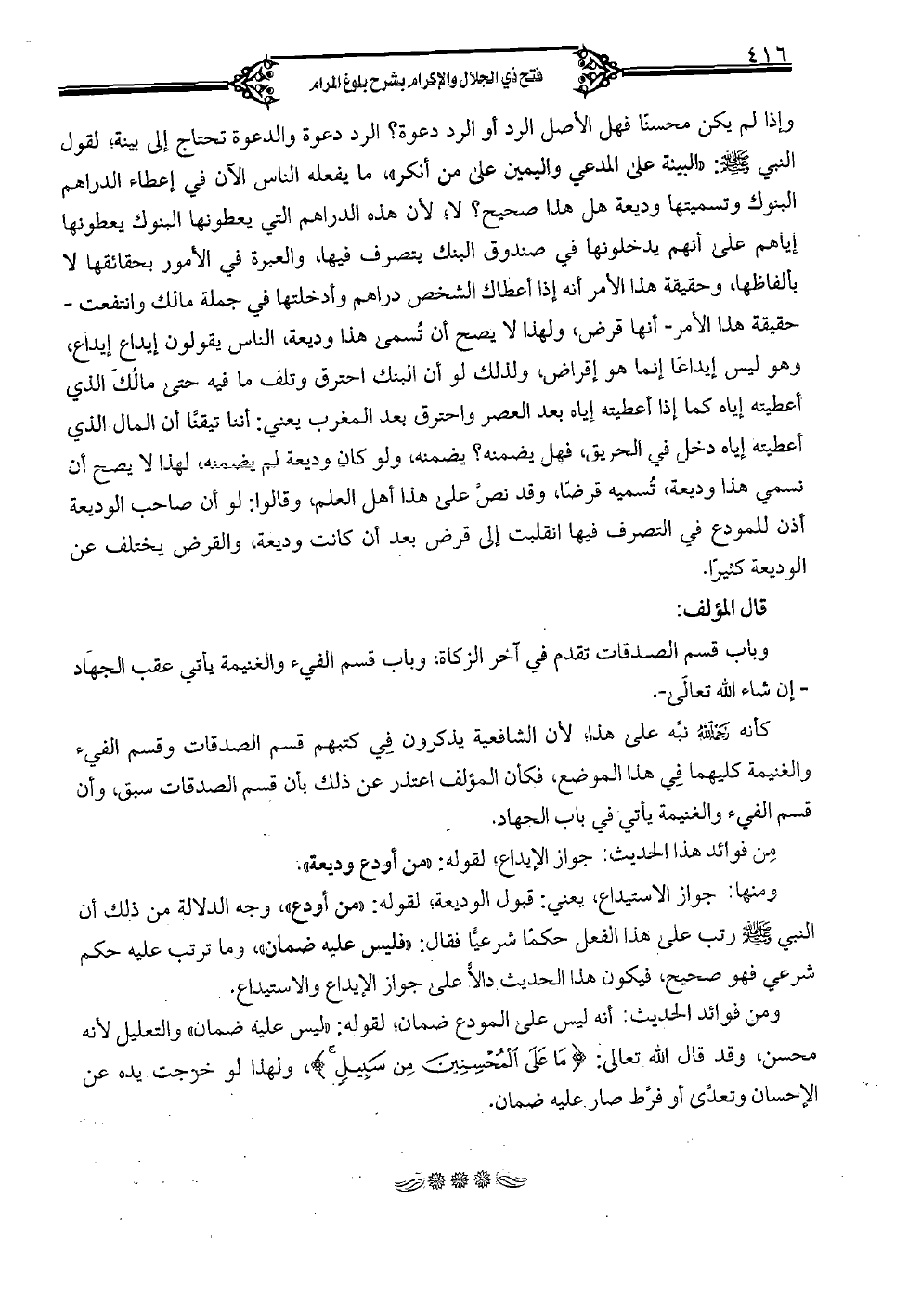 وإذا لم يكن محسنا فهل الأصل الرد أو الرد دعوة؟ الرد دعوة والدعوة تحتاج إلى بينة؛ لقول النبي (صلى الله عليه وسلم): «البينة على المدعي واليمين على من أنكر»، ما يفعله الناس الآن في إعطاء الدراهم البنوك وتسميتها وديعة هل هذا صحيح؟ لا، لأن هذه الدراهم التي يعطونها البنوك يعطونها إياهم على أنهم يدخلونها في صندوق البنك يتصرف فيها، والعبرة في الأمور بحقائقها لا بألفاظها، وحقيقة هذا الأمر أنه إذا أعطاك الشخص دراهم وأدخلتها في جملة مالك وانتفعت - حقيقة هذا الأمر- أنها قرض، ولهذا لا يصح أن تُسمى هذا وديعة، الناس يقولون إيداع إيداع، وهو ليس إيداعًا إنما هو إقراض، ولذلك لو أن البنك احترق وتلف ما فيه حتى مالك الذي أعطيته إياه كما إذا أعطيته إياه بعد العصر واحترق بعد المغرب يعني: أنتا تيقنًا أن المال الذي أعطيته إياه دخل في الحريق، فهل يضمنه؟ يضمنه، ولو كان وديعة لم يضمنه، لهذا لا يصح أن نسمى هذا وديعة، تُسميه قرضا، وقد نصر على هذا أهل العلم، وقالوا: لو أن صاحب الوديعة أذن للمودع في التصرف فيها انقلبت إلى قرض بعد أن كانت وديعة، والقرض يختلف عن الوديعة كثيرًا.
