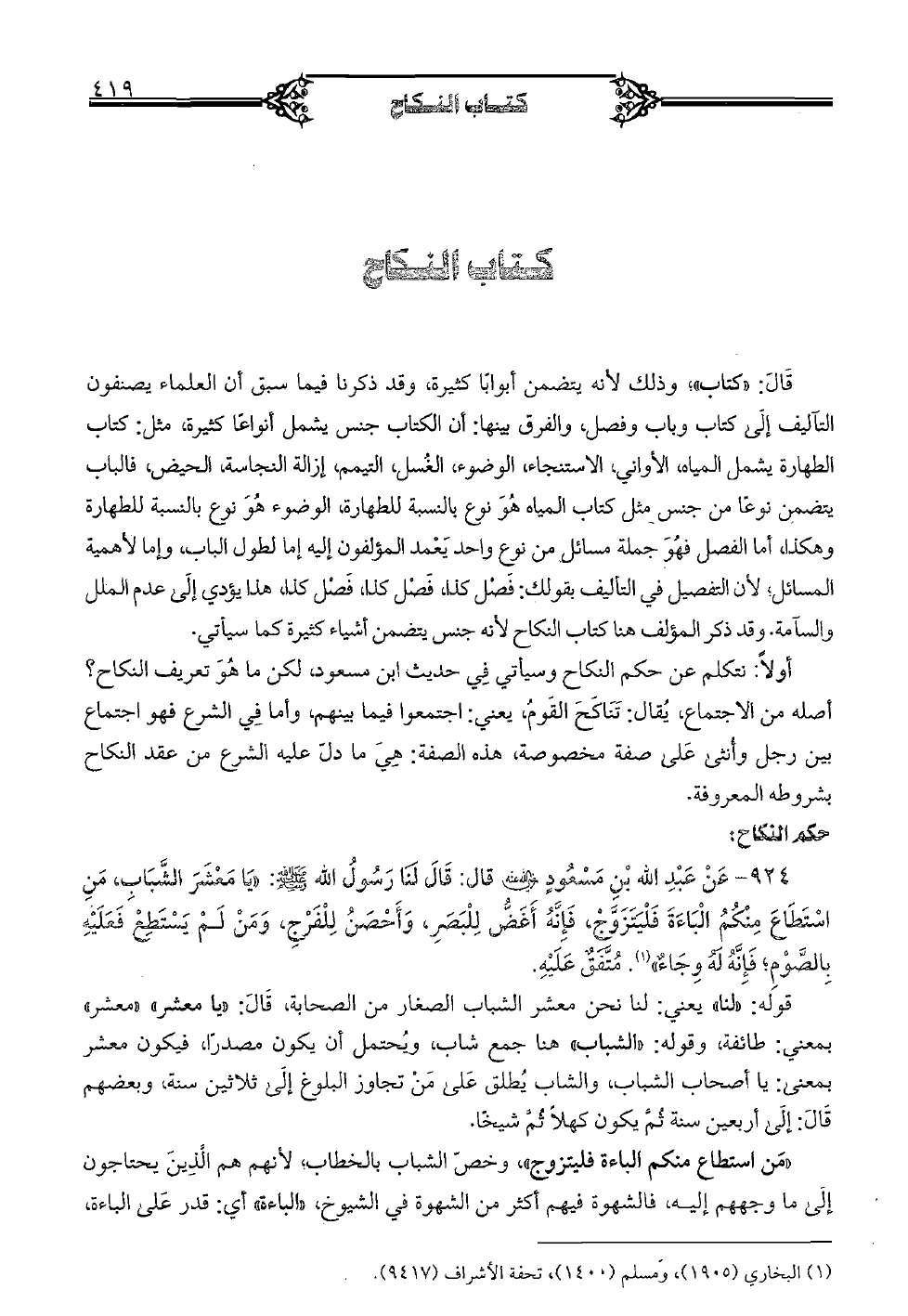 «من استطاع منكم الباءة فليتزوج» وخصّ الشباب بالخطاب؛ لأنهم هم الذين يحتاجون إلى ما وجههم إليه، فالشهوة فيهم أكثر من الشهوة في الشيوخ، «الباءة» أي: قدر على الباءة،